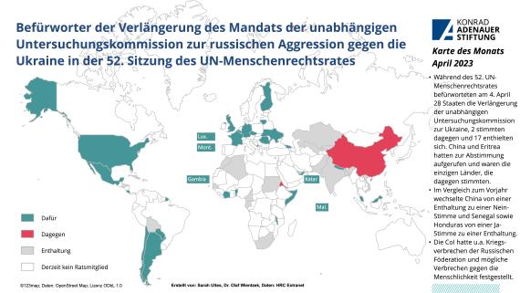 Die 52. Sitzung des UN-Menschenrechtsrates in Genf war mit 14 Wochen die längste Sitzung seit Gründung des Rates. 43 Resolutionen zu Ländersituationen, u.a. zu Myanmar, Südsudan, Nicaragua, Mali, Libyen, VR-Korea oder Belarus sowie zu verschiedenen Themen, u.a. zu Glaubensfreiheit oder zum neuen Recht auf eine saubere, gesunde und nachhaltige Umwelt wurden besprochen. Auch die unabhängige internationale Untersuchungskommission zur Ukraine stellte ihren jüngsten Bericht vor, in welchem sie u.a. Beweise für eine Vielzahl von Verstößen gegen die internationalen Menschenrechtsnormen und das humanitäre Völkerrecht vorstellten, von welchen viele Kriegsverbrechen darstellen. Darüber hinaus könnten die Angriffe der russischen Streitkräfte auf die energiebezogene Infrastruktur der Ukraine und die Anwendung von Folter durch russische Behörden Verbrechen gegen die Menschlichkeit darstellen. Die Verlängerung der Kommission um ein weiteres Jahr wurde, nachdem China und Eritrea zu einer Abstimmung aufgerufen hatte, mit 28 Ja-Stimmen, 2 Gegenstimmen und 17 Enthaltungen angenommen.