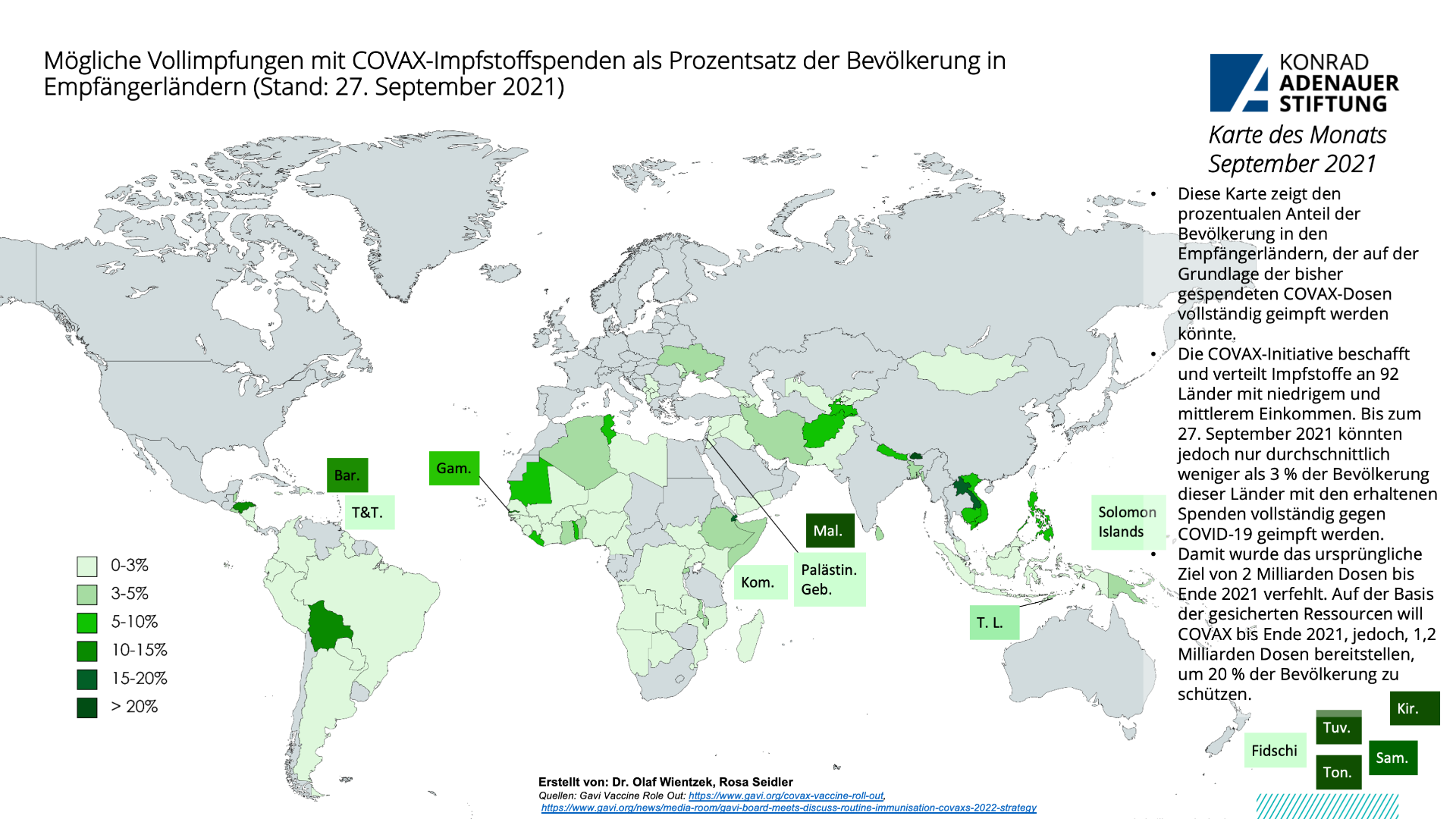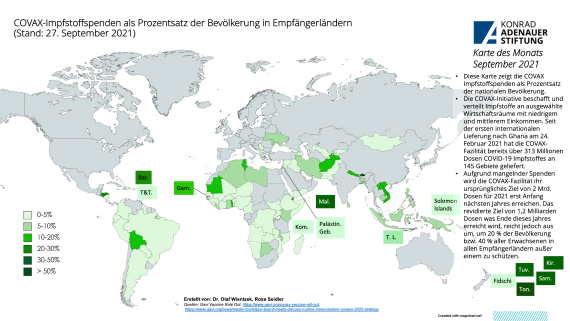 Die Karte des Monats September veranschaulicht wie viele COVAX Impfstoffspenden in den Empfängerländern bis Ende September eingegangen sind. Die COVAX-Fazilität, die von der Coalition for Epidemic Preparedness Innovations (CEPI), Gavi und der Weltgesundheitsorganisation (WHO) gemeinsam geleitet wird, setzt sich für schnellen, fairen und gerechten Zugang zu COVID-19-Impfstoffen in der ganzen Welt ein. Seit der ersten internationalen Lieferung nach Ghana am 24. Februar 2021 hat die COVAX-Fazilität bereits über 313 Mio. Dosen verschiedener COVID-19 Impfstoffe an 145 Gebiete geliefert. Aufgrund mangelnder Spenden wird die COVAX-Fazilität ihr ursprüngliches Ziel von 2 Mrd. Dosen für 2021 jedoch erst Anfang nächsten Jahres erreichen. Das revidierte Ziel von 1,2 Mrd. Dosen, welches Ende dieses Jahres erreicht wird, reicht aus um nahezu 20 % der jeweiligen Bevölkerungen, bzw. 40 % der Erwachsenen in allen Empfängerländern zu schützen.