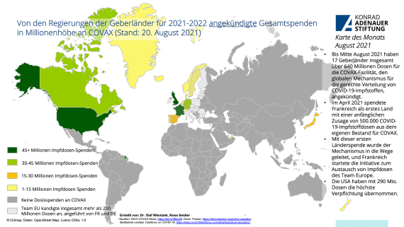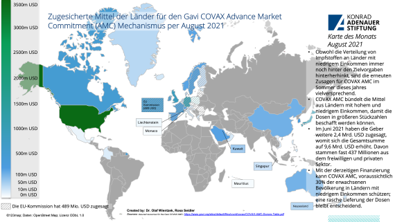 Die COVAX-Fazilität, die von der Coalition for Epidemic Preparedness Innovations (CEPI), Gavi und der Weltgesundheitsorganisation (WHO) gemeinsam geleitet wird, umfasst mehrere parallele Mechanismen, um den schnellen, fairen und gerechten Zugang zu COVID-19-Impfstoffen in der ganzen Welt zu verbessern. Die Karte des Monats August veranschaulicht die Beiträge der Geberländer zu zwei verschiedenen Strukturen, über die die COVAX-Initiative Impfstoffe beschafft und an die 92 in Frage kommenden Länder mit niedrigem und mittlerem Einkommen verteilt. Während die COVAX-Fazilität die Verteilung von Dosen aus dem bestehenden nationalen Bestand eines Geberlandes ermöglicht, wurden im Rahmen des COVAX Advance Market Commitment (AMC)-Mechanismus bereits vor der erfolgreichen Impfstoffentwicklung finanzielle Mittel aus Ländern mit hohem und niedrigem Einkommen gesammelt und mit pharmazeutischen Partnern zusammengearbeitet, damit Dosen in großem Umfang produziert und für Länder mit niedrigem und mittlerem Einkommen beschafft werden können, sobald die Impfstoffe die Zulassung erhalten.