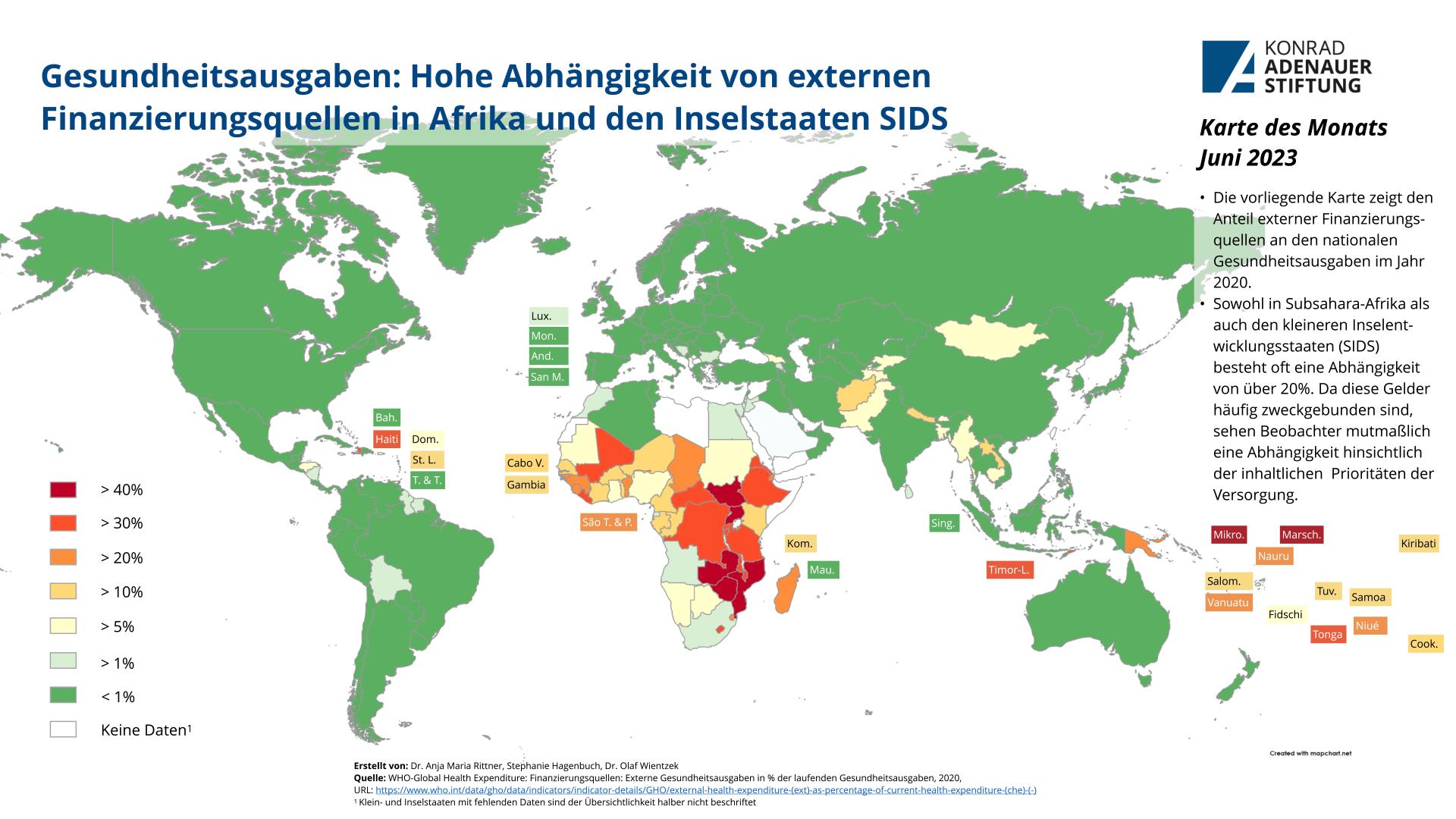 Im Kontext der Pandemievereinbarungen diskutieren die WHO-Mitgliedstaaten eine stärkere Verpflichtung zu Investitionen in ihre eigene Gesundheitsversorgung im Sinne einer besseren Pandemieprävention, -vorsorge und -reaktion. Allerdings liegt der Anteil externer Finanzierungsquellen an den nationalen Gesundheitsausgaben gerade in den Ländern in Subsahara-Afrika als auch den kleineren Inselentwicklungsstaaten (SIDS) oft über 20%. Oft sind diese Gelder zweckgebunden. Zur Stärkung der Gesundheitsversorgung im allgemeinen sind sie daher nur bedingt geeignet, vielmehr sehen Beobachter mutmaßlich eine Abhängigkeit hinsichtlich der inhaltlichen Prioritäten der Versorgung.
