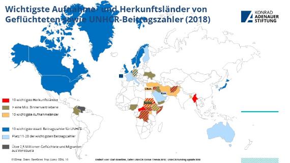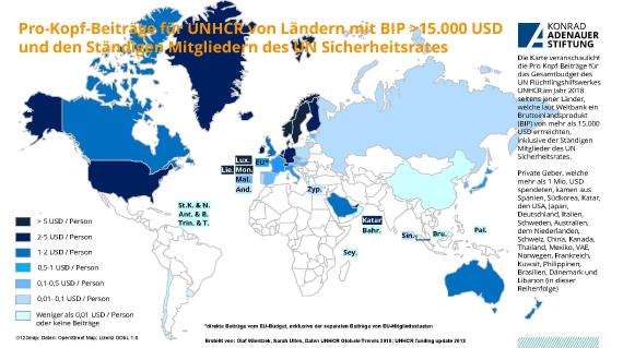 Am 17./18. Dezember fand in Genf der erste globale Flüchtlingsgipfel statt, bei dem Zusagen in Milliardenhöhe für die Verbesserung der Situation von Geflüchteten gemacht wurden. Wie sah die Lage 2018 aus? Welche Länder waren wichtigste Herkunfts- und Aufnahmeländer? Welche Staaten waren die größten Unterstützer des UN-Flüchtlingswerks UNHCR? Wieviel gaben die verhältnismässig wohlhabenderen Länder pro Kopf für die Arbeit des Flüchtlingshilfswerks aus? Welche Länder hatten vor einem Jahr nicht für die Annahme des globalen Pakts für Flüchtlinge gestimmt?