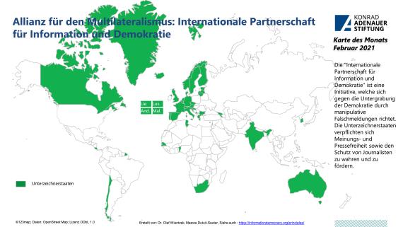 Am 24. Februar traf sich die Allianz für den Multilateralismus am Rande des 46. Menschenrechtsrates in Genf. Unter der Überschrift "neue Grenzen für Menschenrechte, Vorbereitung und Reaktion auf Pandemien" wurde u.a. die aktuelle Bedeutung der Internationalen Partnerschaft für Information und Demokratie hervorgehoben. Sie richtet sich gegen die Untergrabung der Demokratie durch manipulative Falschmeldungen. Die Unterzeichnerstaaten verpflichten sich Meinungs- und Pressefreiheit sowie den Schutz von Journalisten zu wahren und zu fördern.
