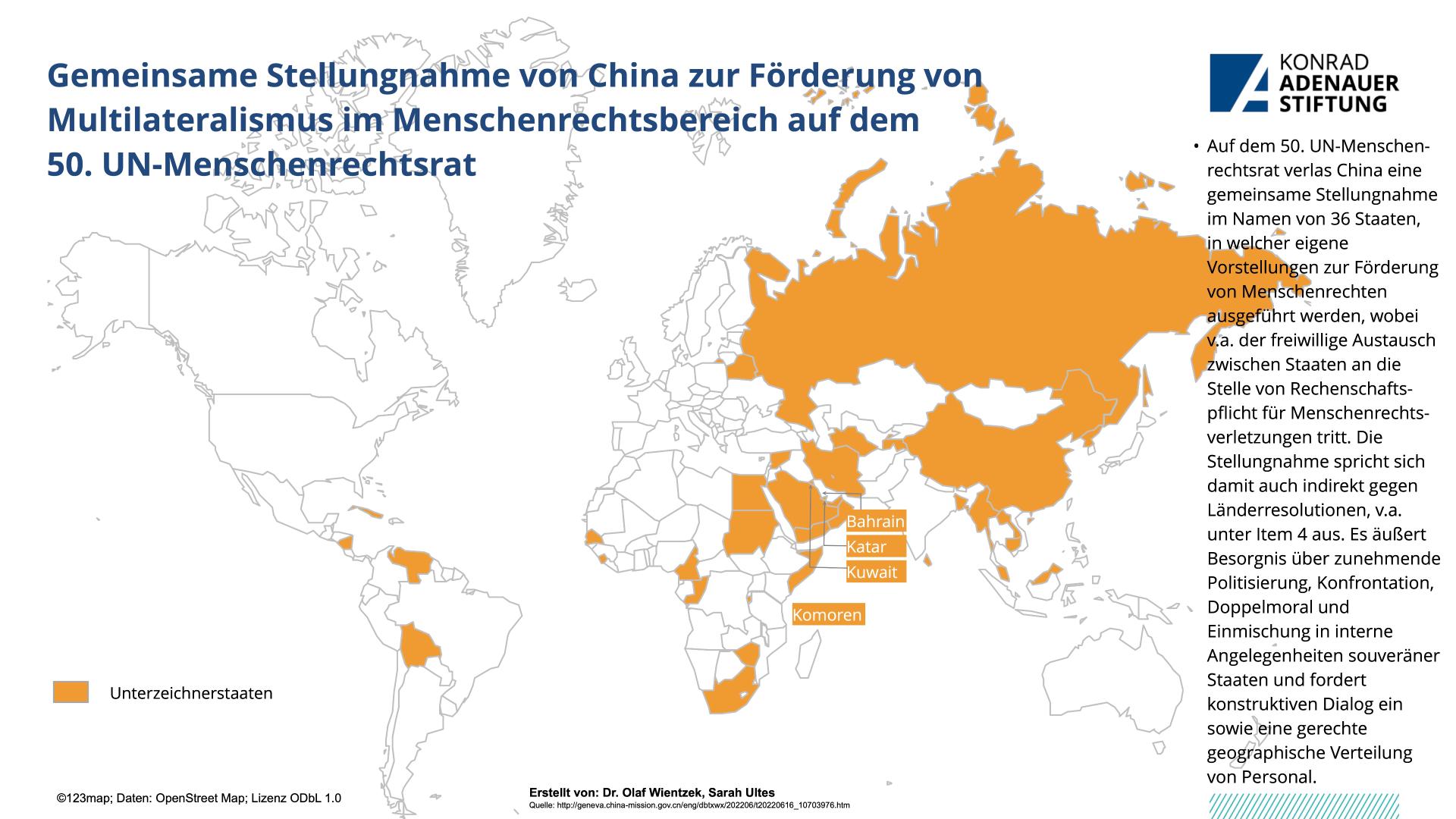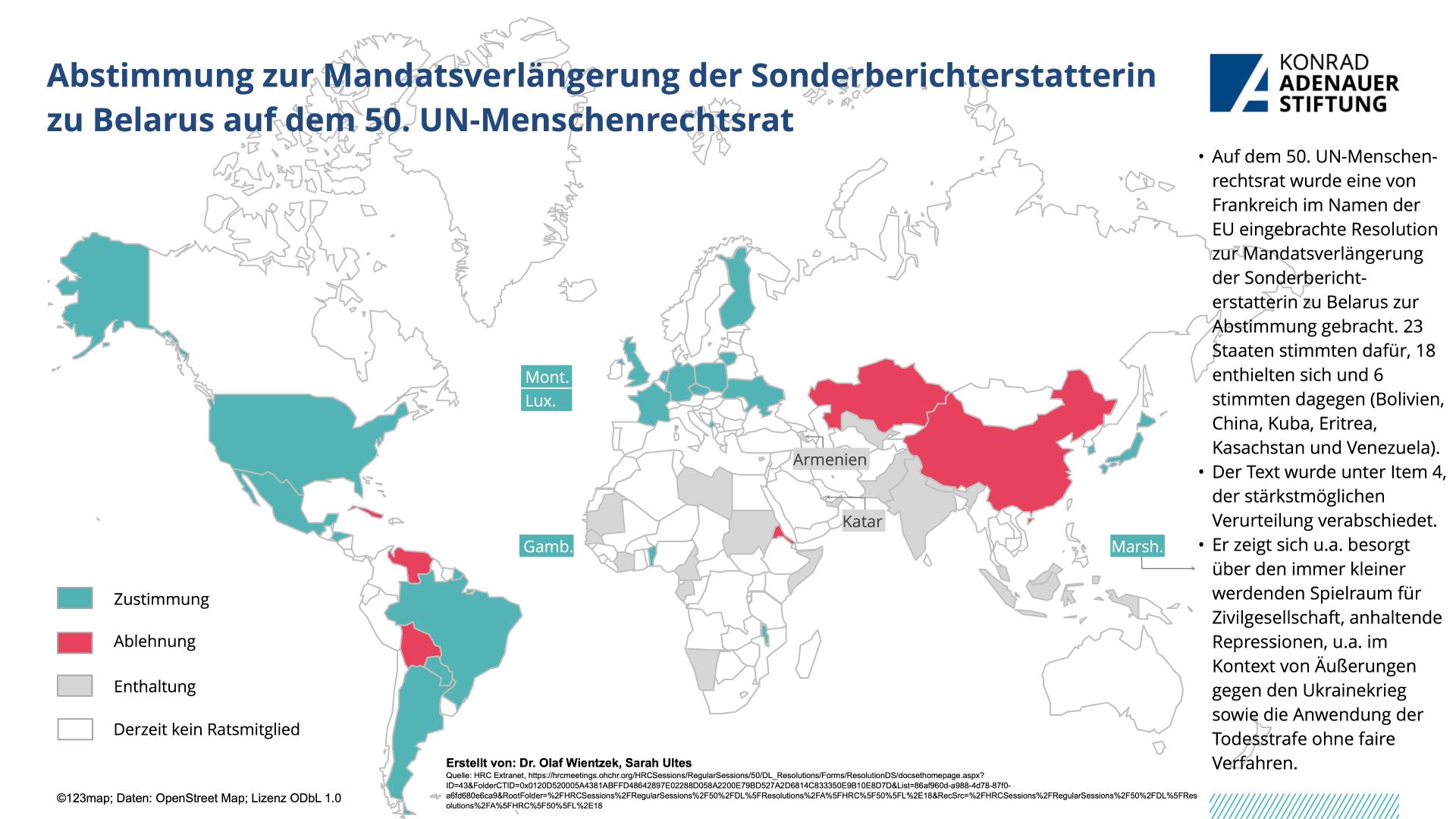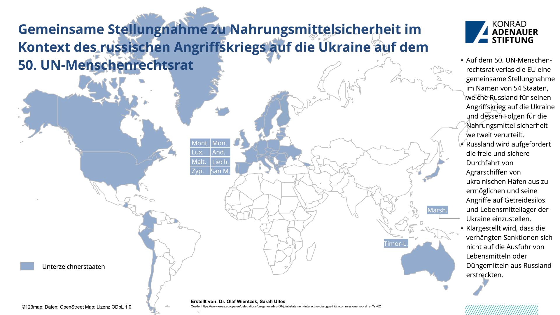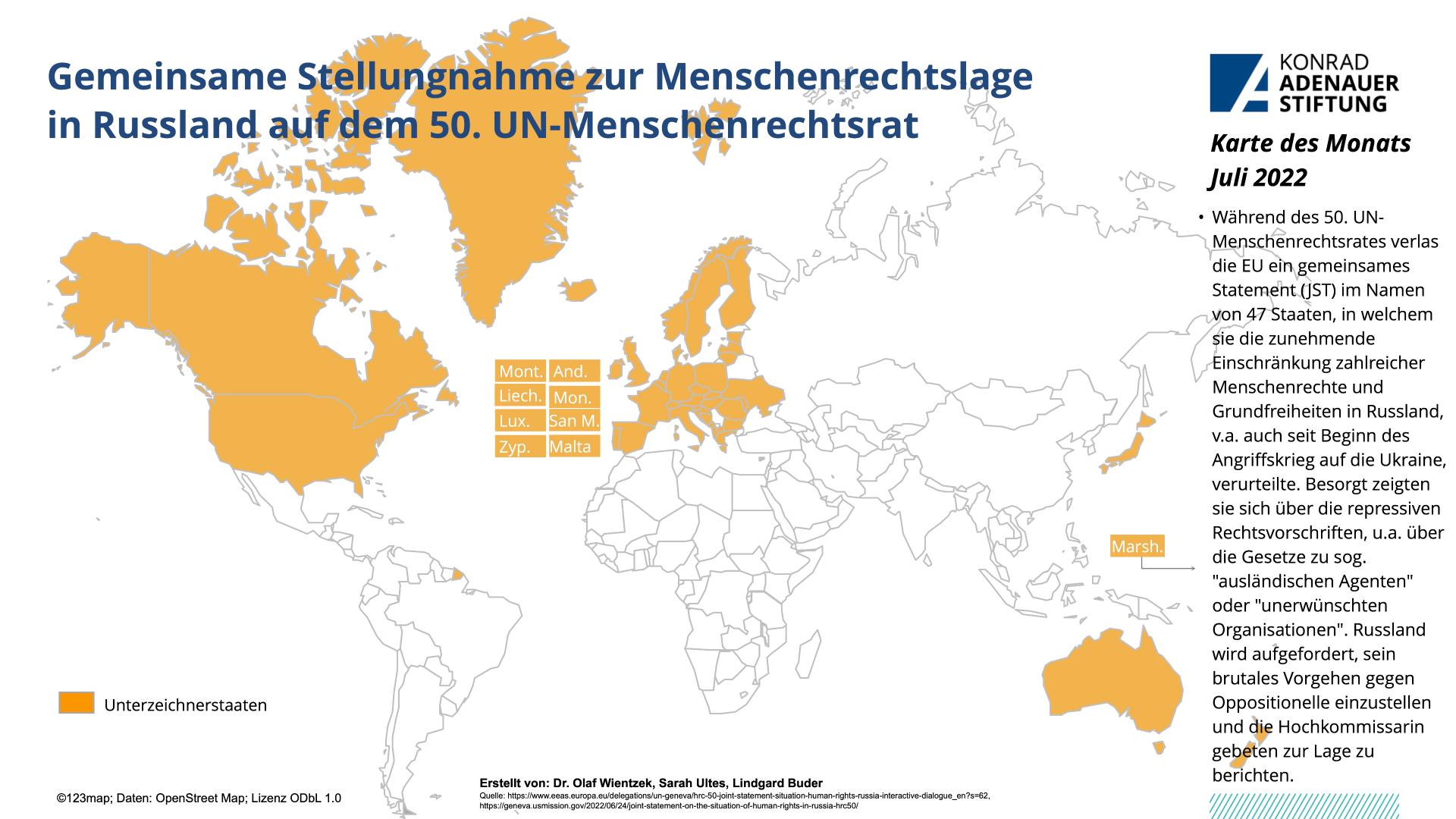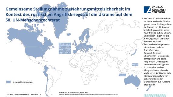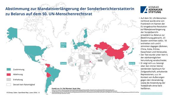 Vom 13. Juni bis 8. Juli tagte der 50. UN-Menschenrechtsrat in Genf. Hierbei waren die Auswirkungen des russische Angriffskrieges gegen die Ukraine eines der zentralen Themen, welche u.a. auch mit einer gemeinsamen Stellungnahme zur Nahrungsmittelsicherheit adressiert wurde. Aber auch die zunehmende Einschränkung zahlreicher Menschenrechte und Grundfreiheiten in Russland, v.a. seit Kriegsbeginn wurde verurteilt. Auch die Lage in China wurde adressiert und die zeitnahe Veröffentlichung des Berichts zu Xinjiang gefordert. Zudem war Gender eines der zentralen Themen. Neben einer Dringlichkeitsdebatte zu Frauenrechten in Afghanistan, konnten auch zahlreiche Resolutionen verabschiedet werden, u.a. zur Verlängerung des Mandats des unabhängigen Experten zum Schutz vor Gewalt und Diskriminierung auf der Basis von sexueller Orientierung und Geschlechtsidentität. Auch das Mandat der Sonderberichterstatterin zu Belarus konnte verlängert werden.