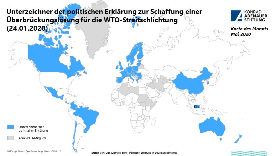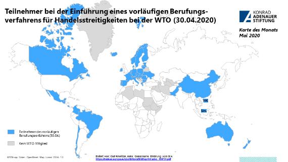 Seit Dezember 2019 war das Berufungsorgan der Welthandelsorganisation (WTO) blockiert. Damit war eine wichtige Säule der WTO schwer beschädigt. Am 30. April haben sich 19 WTO-Mitglieder (darunter auch die EU) darauf geeinigt, ein vorläufiges Berufungsverfahren für Handelsstreitigkeiten einzuführen. Dieses Verfahren stützt sich auf bestehende WTO-Regeln und soll nur so lange zur Anwendung kommen, bis das Berufungsorgan wieder funktionsfähig ist. Bereits am 24. Januar hatten 17 WTO-Mitglieder in Davos diesen Schritt öffentlichkeitswirksam angekündigt. Die Liste der letztlich teilnehmenden Länder hat sich in der Zwischenzeit allerdings verändert. Die vorliegende Karte zeigt die an der politischen Erklärung und nun am vorläufigen Berufungsverfahren beteiligten Länder.
