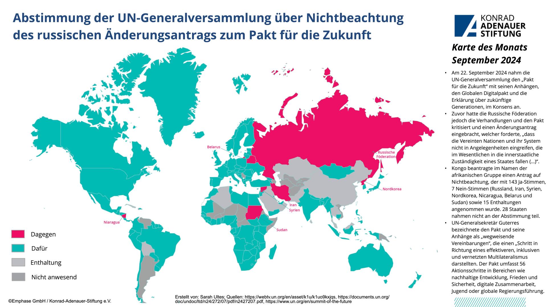 Am 22. September 2024 nahm die UN-Generalversammlung den „Pakt für die Zukunft“ mit seinen Anhängen, den Globalen Digitalpakt und die Erklärung über zukünftige Generationen, im Konsens an. Zuvor hatte die Russische Föderation jedoch die Verhandlungen und den Pakt kritisiert und einen Änderungsantrag eingebracht, welcher forderte, „dass die Vereinten Nationen und ihr System nicht in Angelegenheiten eingreifen, die im Wesentlichen in die innerstaatliche Zuständigkeit eines Staates fallen (...)“. Kongo beantragte im Namen der afrikanischen Gruppe einen Antrag auf Nichtbeachtung, der mit 143 Ja-Stimmen, 7 Nein-Stimmen (Russland, Iran, Syrien, Nordkorea, Nicaragua, Belarus und Sudan) sowie 15 Enthaltungen angenommen wurde. 28 Staaten nahmen nicht an der Abstimmung teil. UN-Generalsekretär Guterres bezeichnete den Pakt und seine Anhänge als „wegweisende Vereinbarungen“, die einen „Schritt in Richtung eines effektiveren, inklusiven und vernetzten Multilateralismus darstellten. Der Pakt umfasst 56 Aktionsschritte in Bereichen wie nachhaltige Entwicklung, Frieden und Sicherheit, digitale Zusammenarbeit, Jugend oder globale Regierungsführung.