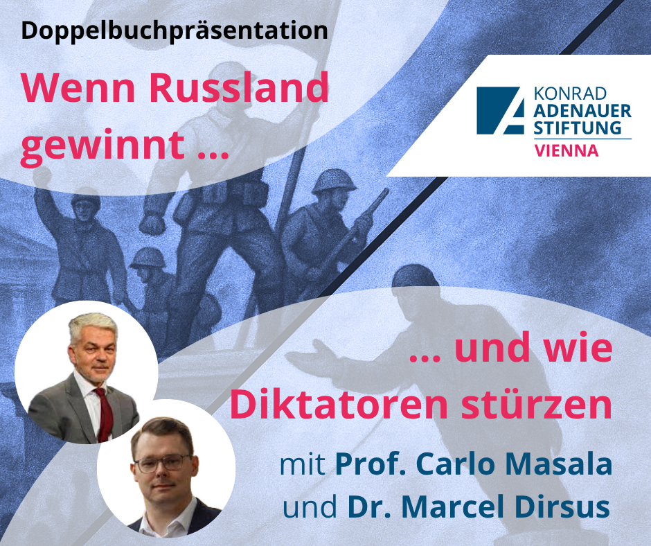 Um uns dabei aber nicht ganz in Untergangszenarien zu verlieren, haben wir die Veranstaltung bewusst als Doppelbuchvorstellung organsiert und stellen Masala das unlängst auf Deutsch erschienene Buch von Dr. Marcel Dirsus „Wie Diktatoren stürzen … und wie Demokratien siegen können“ gegenüber. Darin zeigt der Autor, dass Alleinherrschaften wie die des russischen Machthabers Wladimir Putin nicht auf Dauer funktionieren können, denn sie haben Systemfehler. So stark und unbesiegbar sich Diktatoren gerne geben, leben sie doch in ständiger Angst, denn sie haben immer mehr Feinde als Freunde und das Ende ihrer Herrschaft ist oft dramatisch.