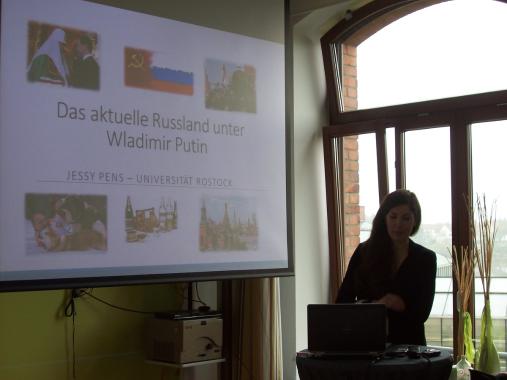 Der Abschlusstag begann zunächst mit einem Vortrag von Frau Jessy Pens von der Universität Rostock zur aktuellen Situation Russlands unter der Präsidentschaft Wladimir Putins. Nach ihrem Vortrag diskutierten die Teilnehmer intensiv sowohl über die Lage in Russland selbst wie über die deutsch-russischen Beziehungen und deren zukünftige Entwicklung.