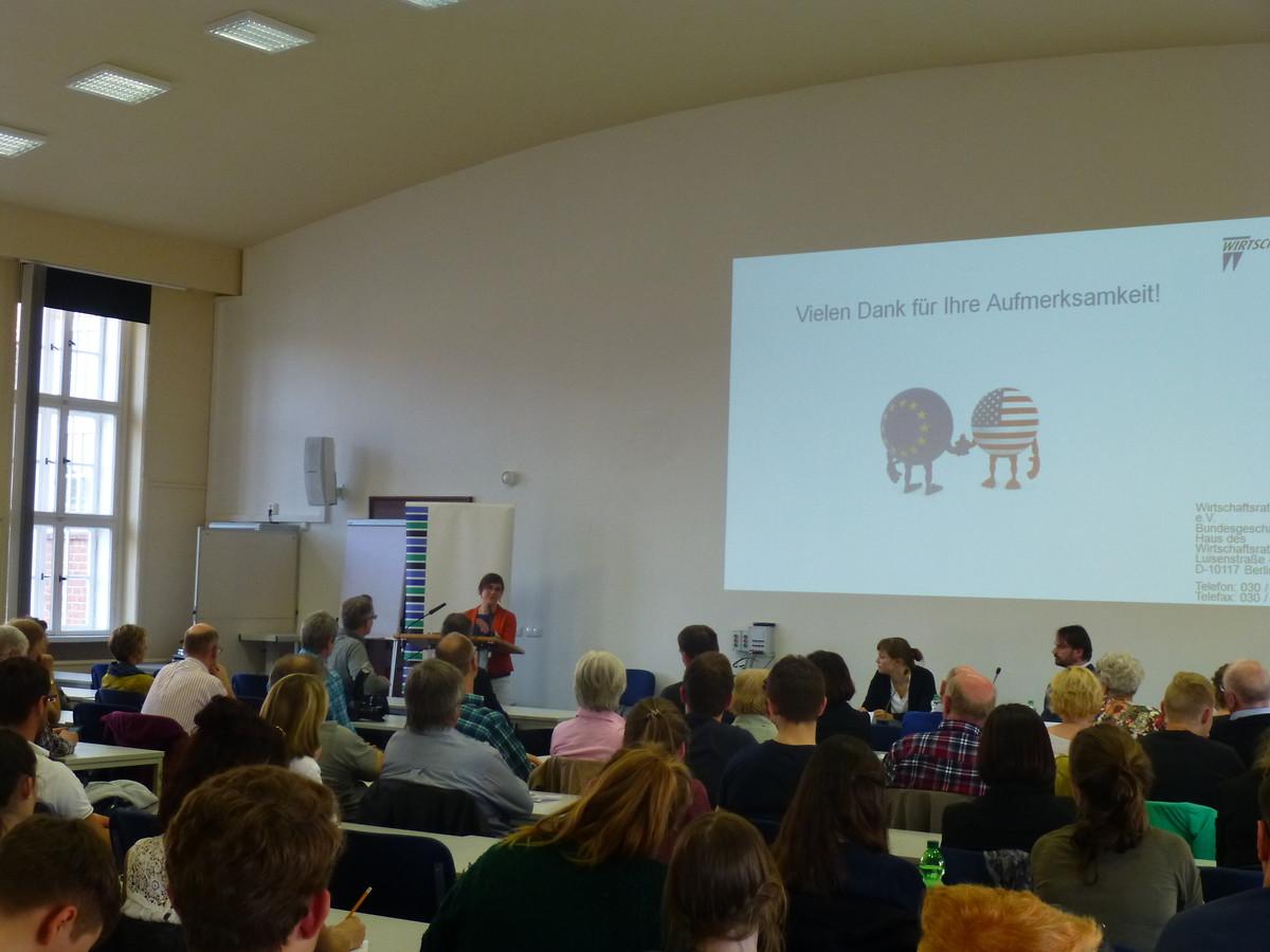 Frau Vasters informierte zunächst über Freihandel und stellte klar, dass Freihandel nicht gesetz- und regellos sei, sondern einen Versuch der möglichst engen Verzahnung von Regelwerken darstelle. TTIP solle die EU und die USA zum größten Wirtschaftsraum der Welt machen und somit zum weltwirtschaftlichen Taktgeber werden lassen. Die Standards beider Akteure seien dabei weltweit am höchsten und diese gelte es zu verteidigen. Standards im Bereich von Gesundheit, Lebensmittel- und Verbraucherschutzes würden dabei - anders als von vielen TTIP-Gegnern behauptet - nicht angetastet. Auch die Transparenz der Verhandlungen sei erheblich verbessert worden, so seien die Textvorschläge der EU für die Öffentlichkeit einsehbar. Auch NGO´s seien stark in die Verhandlungen eingebunden.