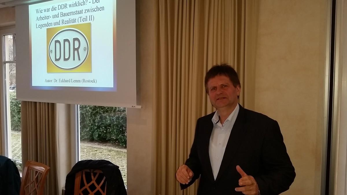 Wie war die DDR wirklich? Dieser Frage wurde am 10. April 2018 bei einem Vortrags- und Diskussionsabend im Ostseebad Kühlungsborn nachgegangen. Der Referent, Dr. Eckhard Lemm, war bis 1990 Bürger der DDR, weiß also, worüber er spricht, wenn er Probleme des SED-Staates thematisiert. Da selbstverständlich kein vollständiges und widerspruchsloses Bild geliefert werden kann, waren die Veranstaltungsteilnehmer herzlich eingeladen, hierzu auch eigene Erfahrungen einzubringen.