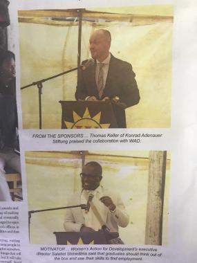 Die Trainings zur beruflichen Qualifikation werden bereits seit mehreren Jahren von WAD als implementierendem Stiftungspartner vor allem in den ländlichen Regionen Namibias umgesetzt und haben das Ziel, jungen Menschen ohne formelle Ausbildung durch Qualifikationen einen Zugang zum namibischen Arbeitsmarkt zu ermöglichen. Thomas W. Keller, Büroleiter der KAS Namibia-Angola, betonte in diesem Zusammenhang auch noch einmal vor allen Anwesenden die große Bedeutung, welche die Stiftung der Partnerschaft mit WAD beimisst:"We are a political foundation close to the Christian Democratic Party in Germany and we share the same values: Human rights, multiparty approach, gender equality and social market economy. We don't do this alone, we always partner. Without WAD allowing us to contribute, our work would not be possible."