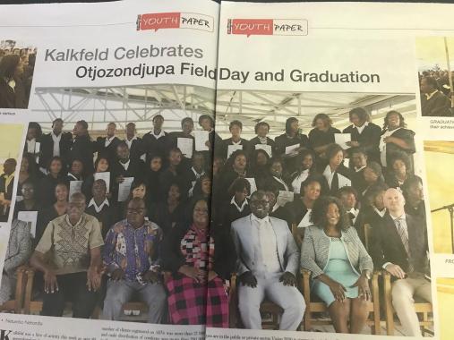 80 junge Namibier aus Kalkfeld feierten am 20.09. gemeinsam mit ihren Familien, Vertretern der Stiftung, des langjährigen Partners Women's Action for Development (WAD), Deputy Minister of Industrialisation, Trade and SME Development Lucia Iipumbu und zahlreichen andere Regierungsvertreter aus der Region den Abschluss ihres berufsbildenden Trainingsprogramms und den Erhalt ihrer Ausbildungszertifikate. Die bisher arbeitslosen Teilnehmer wurden in den Bereichen Handarbeit, IT, Office Administration sowie Hotel- und Tourismusmanagement trainiert. Gefeiert wurde auch die Tatsache, dass es einigen der Absolventen gelang, mit ihrer neuen Qualifikation direkt im Anschluss eine Anstellung zu finden.