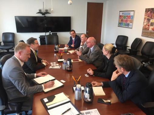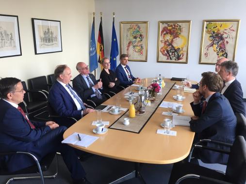 Zum Auftakt seines Besuchs in New York wurde Prof. Dr. Lammert von Dr. Christoph Heusgen, dem Ständigen Vertreter Deutschlands bei den Vereinten Nationen in New York, begrüßt, der die deutsche UN Politik und ihre Zielsetzung erläuterte.