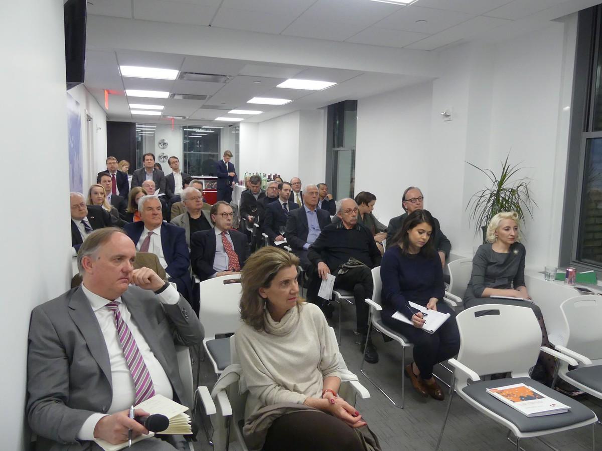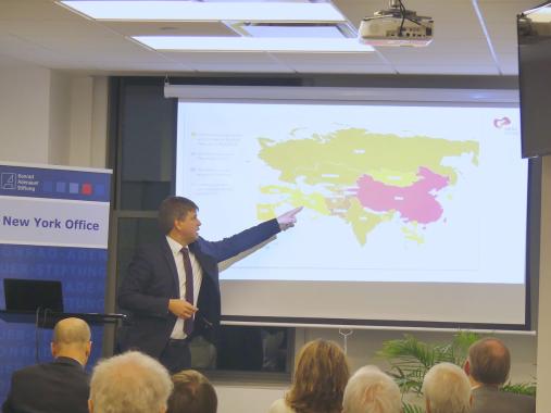 Im Verlauf der anschließenden Diskussion, die ACG-Präsident Steven E. Sokol moderierte, wurde u.a. kritisch angemerkt, dass China transatlantische und europäische Rahmenbedingungen in Frage stelle. Zudem würden die verschiedenen Akteure oft grundlegend unterschiedliche Ansichten vertreten, z.B. hinsichtlich der Frage, was unter Terrorismus oder Cybersicherheit zu verstehen sei. Angesichts künftiger Probleme und Herausforderungen dürften Errungenschaften, wie beispielsweise die gemeinsame Terrorismusbekämpfung, jedoch nicht in Vergessenheit geraten. Zugleich wurde deutlich: Es gibt auch Themen, in denen eine große Übereinstimmung zwischen China, Europa und den USA herrsche, so beispielsweise in puncto Friedenssicherung, Sicherheit, nachhaltiger Entwicklung sowie der Eigenverantwortung afrikanischer Staaten.