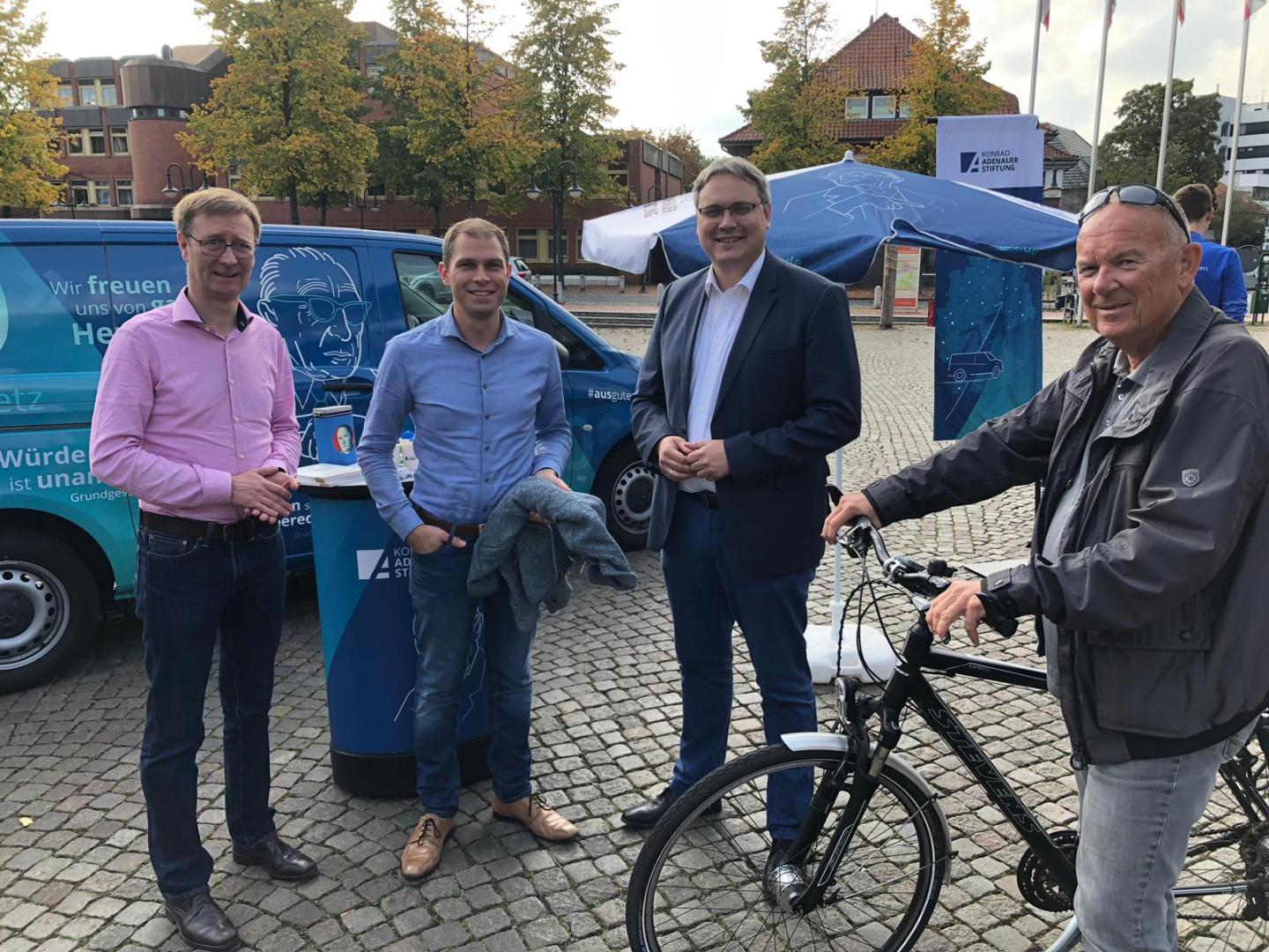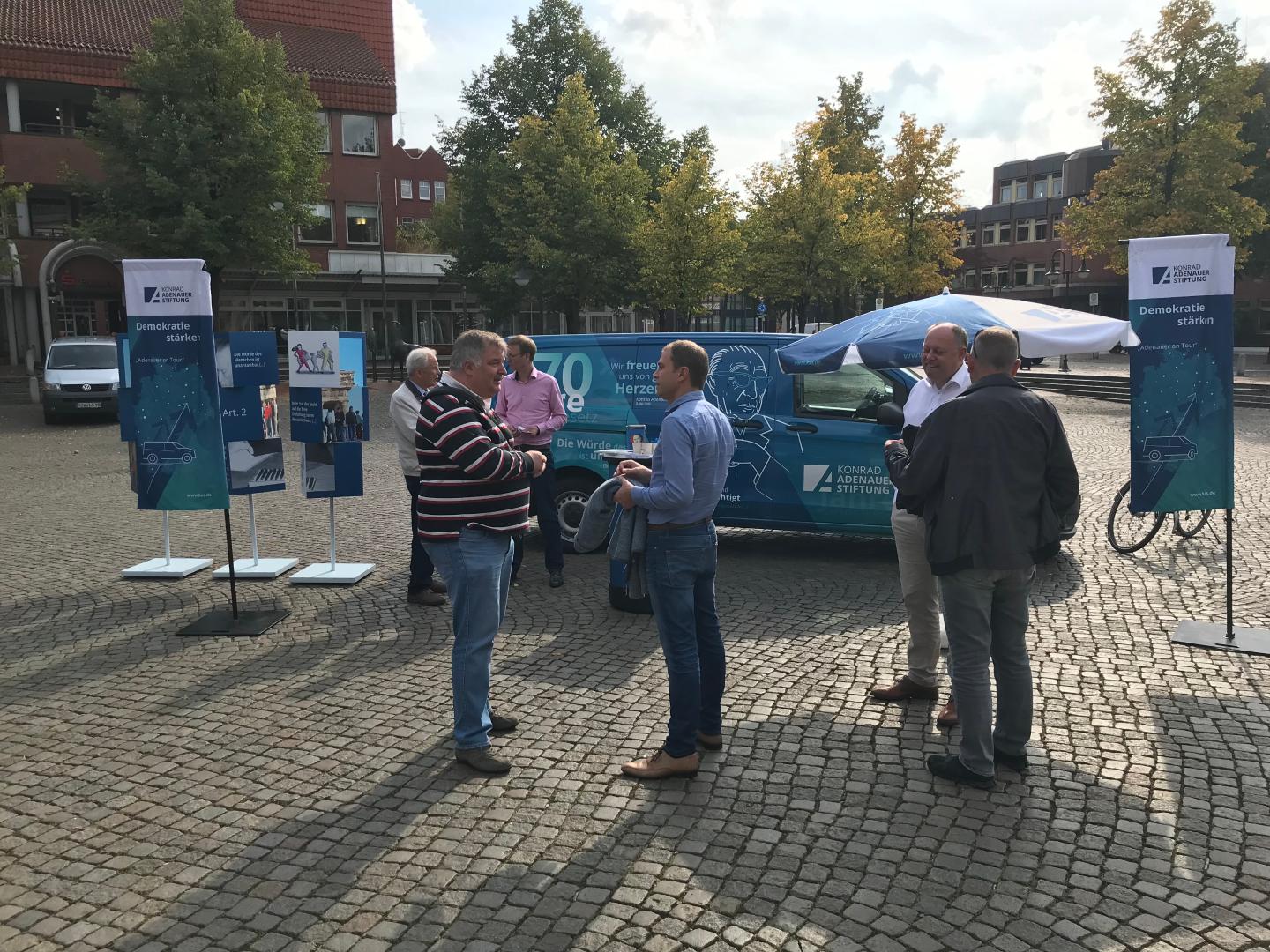 Vom 20. bis 26. September waren wir im Rahmen des Projektes "Gemeinsam.Demokratie.Gestalten (Demokratie Stärken)" auf den Wochenmärkten in Niedersachsen unterwegs. Vom Toleranzfestival der Robert-Bosch-Gesamtschule, über die Wochenmärkte und Innenstädte von Rotenburg an der Wümme, Buchholz in der Nordheide, Buxtehude und Stade waren wir mit unserem neuen "Adenauer-on-Tour-Mobil" unterwegs. Themen waren 70 Grundgesetz und der Zustand unserer heutigen Demokratie. Des Weiteren hatten wir zahlreiche Unterstützung aus der Lokalpolitik, die uns als Ansprechpartner der Bürgerinnen und Bürger bei lokalen Sachverhalten dienten. Vielen Dank für die zahlreichen intensiven Gespräche an den einzelnen Ständen. Wir haben sehr viele wichtige Informationen für unsere Veranstaltungsplanungen für das Jahr 2020 in den angefahrenen Region mitgenommen und kommen gerne mit weiteren Veranstaltungsformaten in die Regionen zurück.