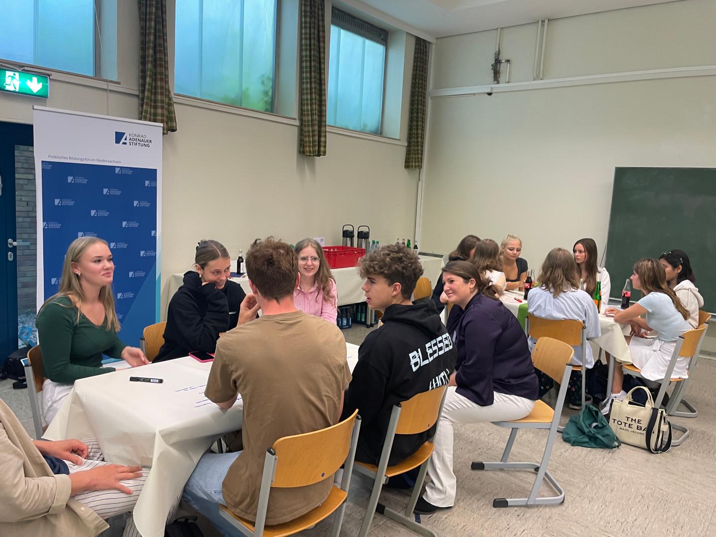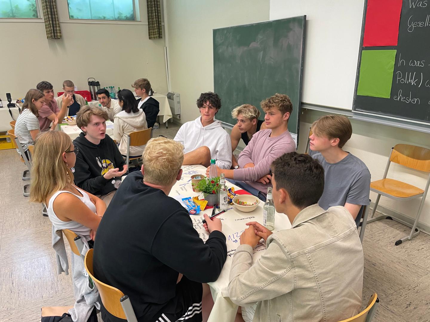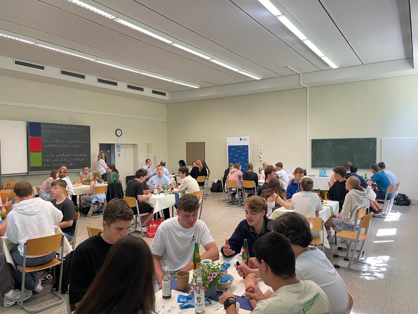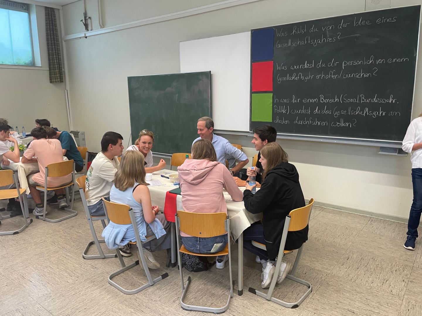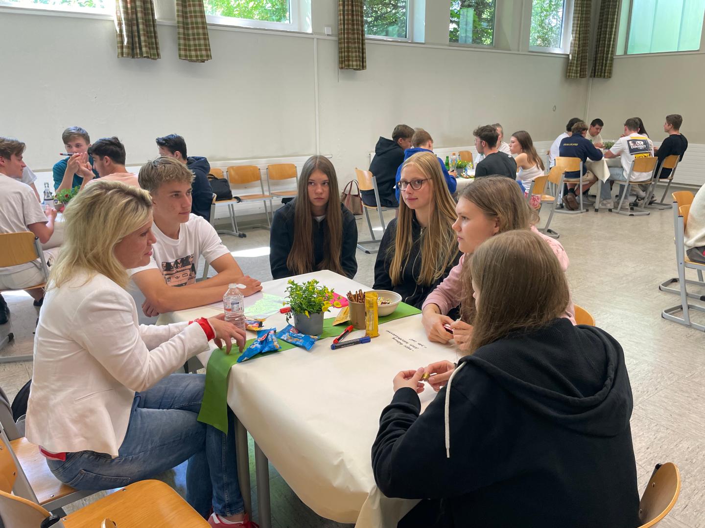 Im Anschluss an die Statements gingen die Schülerinnen und Schüler in die gemeinsame Diskussion über. An insgesamt neun Tischen diskutierten sie in gemütlicher Café-Atmosphäre drei verschiedene Fragenkomplexe. Sie sprachen bspw. darüber, in welchem Bereich sie ein Gesellschaftsjahr absolvieren wollen würden oder wie lange dieses dauern sollte. Jeweils nach 25 Minuten wechselten sie die Tische und diskutierten in neuer Zusammensetzung über den nächsten Fragenkomplex. Wie die Schülerinnen und Schüler wanderten auch die Referenten von Tisch zu Tisch und beteiligten sich an den lebhaften Gesprächen. Die Schülerinnen und Schüler dokumentierten ihre Diskussion auf den Tischdecken, schrieben mit Eddings einzelne Gedankengänge auf und gaben hierdurch auch Impulse für die folgenden Gesprächsrunden.