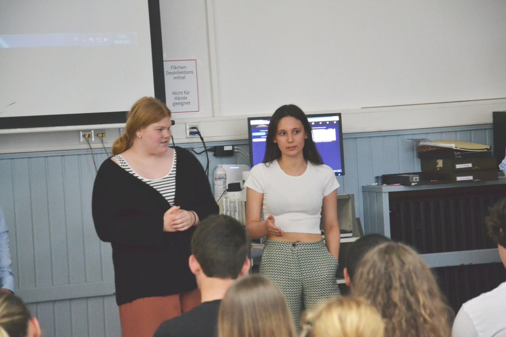 Jeweils zum Abschluss der beiden Durchgänge wurden wieder alle Teilnehmer zusammengeholt. Zunächst berichteten die eingeladenen Referenten von ihren Eindrücken und erklärten, dass sie zuweilen ganz neue Argumente gehört und sich sehr über die unterschiedlichen Meinungen der Teilnehmer gefreut hätten. Es habe sich klar gezeigt, dass einige einer Verpflichtung sehr negativ gegenüberständen, jedoch andere sehr viel Potenzial in einem Gesellschaftsjahr sähen und einer Verpflichtung sehr aufgeschlossen gegenüber seien. Sie versprachen, die Gedanken der Schülerinnen und Schüler für ihre weitere Arbeit mitzunehmen. In Anschluss daran, stellten die Gastgeber der einzelnen Tische, Schülerinnen und Schüler die für die Betreuung der einzelnen Tische verantwortlich waren, die Diskussionsergebnisse zusammenfassend dar. Zum Abschluss nahmen alle Teilnehmer noch an einer kurzen digitalen Abstimmung teil und stimmten dabei u. a. darüber ab, ob ein Pflichtjahr eingeführt werden sollte und worin sie die größten Vor- und Nachteile sehen.