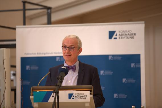 Weiterhin hob der Generalsekretär der Konrad-Adenauer-Stiftung vor, dass politische Bildung in Räumen passieren müsse, wo sie niemand erwarte. In diesem Zusammenhang forderte er die Kooperation mit Anderen, um demokratiefördernde Projekte zu realisieren. Abschließend nahm er die Auftaktveranstaltung zum Anlass, die Verdienste von Christian Wulff an der Stärkung der Demokratie und Integration in Deutschland und für die Konrad-Adenauer-Stiftung zu würdigen. Er ehrte Christian Wulff, der von 1981-1986 Stipendiat der Konrad-Adenauer-Stiftung war und später von 2003-2007 Beiratsmitglied und seit 2017 als Kuratoriumsmitglied der Konrad-Adenauer-Stiftung fungiert. Auch im Namen des KAS-Vorsitzenden, Prof. Norbert Lammert, dankte Michael Thielen den Verdiensten von Christian Wulff.