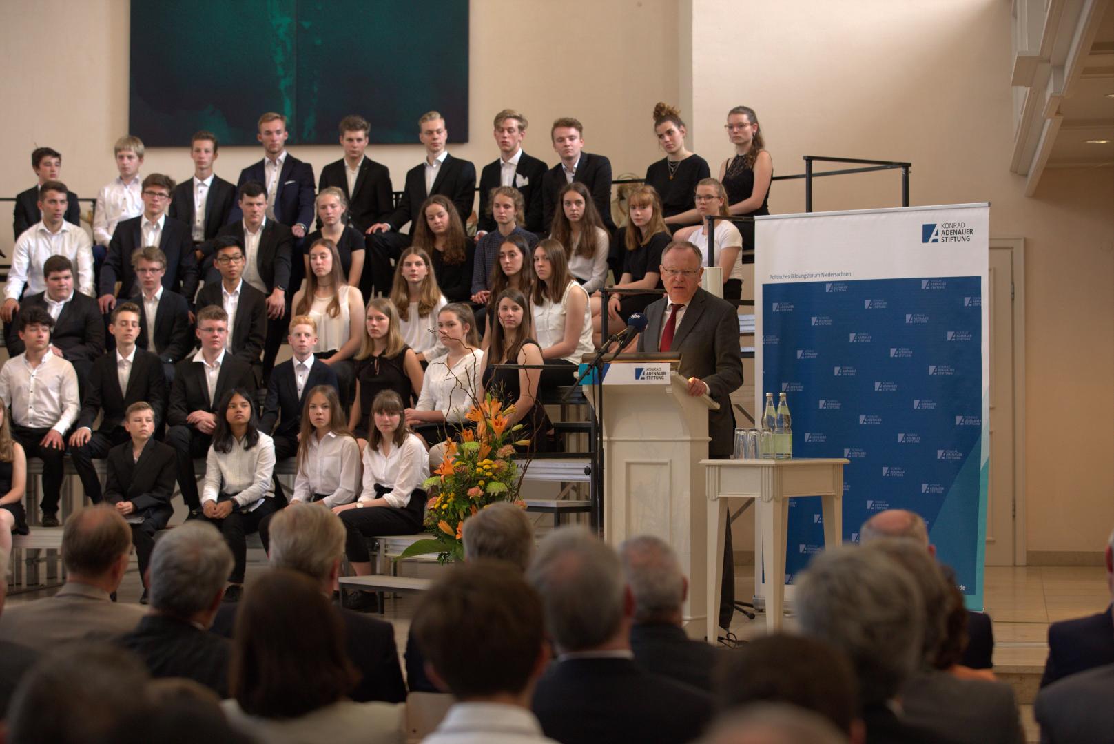 „Die Gedanken sind frei“. Mit diesem Lied leitete der Juventus-Jugendchor des Kaiserin-Auguste-Viktoria-Gymnasiums Celle in die Auftaktveranstaltung von „Demokratie stärken – den gesellschaftlichen Zusammenhalt sichern“ ein. Zu den 400 Gästen zählten der Generalsekretär der Konrad-Adenauer-Stiftung, Michael Thielen, der niedersächsische Ministerpräsident Stephan Weil (SPD) und der Wirtschaftsminister und Landesvorsitzende der CDU Niedersachsen, Bernd Althusmann (CDU). Ebenfalls waren viele politische Vertreter sowie Weggefährten und Parteifreunde von Christian Wulff zu Gast, wie der Landesbischof Ralf Meister, die Landessuperintendentin Petra Bahr, der Bundesbank-Vorstand Burkhard Balz, Martin Kind, Dirk Roßmann, der ehemalige DFB-Chef Reinhard Grindel sowie der Bundesvorsitzende der Jungen Union Deutschlands Tilman Kuban (CDU), Hannovers Oberbürgermeisterkandidat Eckhard Scholz (CDU) sowie zahlreiche Abgeordnete des niedersächsischen Landtages und Bundestages.