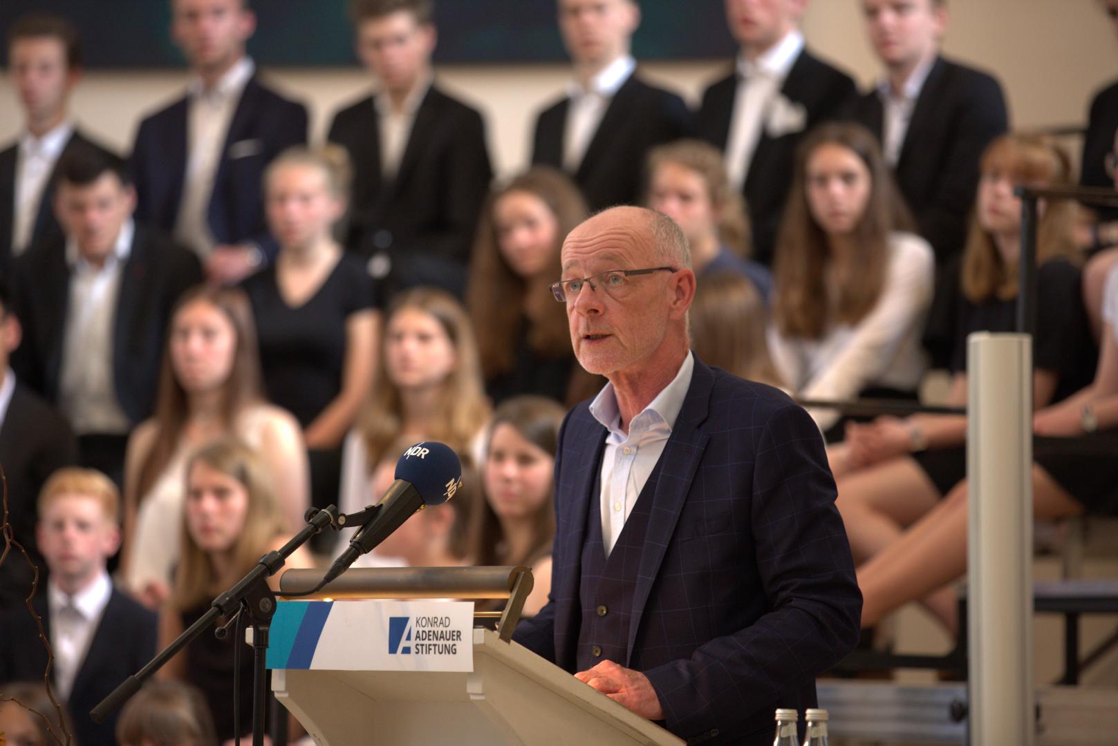 Laut Thielen stehe das demokratische Zusammenleben auf einem Prüfstand. Besonders „die politische Bildung muss sich verantwortlich fühlen für die Vitalität der Demokratie“, so Thielen. Dabei honorierte er alle Bildungseinrichtungen, die täglich Demokratieförderung und politische Bildung an der Basis betreiben. Er forderte: