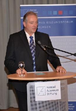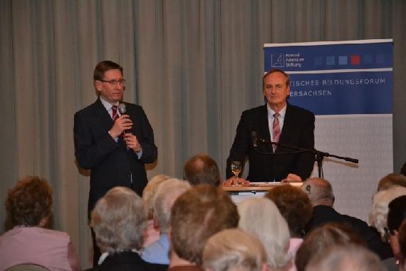 Nachdem Jörg Jäger, Leiter des Politischen Bildungsforums Niedersachsen die Gäste, unter ihnen Goslars Oberbürgermeister Dr. Oliver Junk, im Saal begrüßte, sprach Frank Oesterhelweg MdL, stellvertretender CDU-Fraktionsvorsitzender im Niedersächsischen Landtag das Grußwort und äußerte seine Verunsicherung hinsichtlich der gegenwärtigen Entwicklungen in der Politik. Er griff den Titel der Veranstaltung auf und fügte hinzu, dass sich Deutschland manchmal auch im Spannungsfeld von Gefühl und Verstand befinde. In dieser Situation dürfe sich die Politik und Gesellschaft jedoch nicht selbst überfordern und die Grenzen des Machbaren überschreiten.