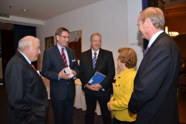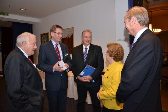 Auch Günther Beckstein ließ die momentane Lage der Flüchtlingsströme nach Europa und insbesondere Deutschland nicht unkommentiert und schilderte aus seinen Erfahrungen als langjähriger Innenminister heraus seine Einschätzung dazu. Er habe sich in seinem Amt fast 20 Jahre mit den Problemen der Zuwanderung beschäftigt und auf seinen Reisen vielerorts sehr bewegende Bilder gesehen, umso wichtiger sei nun die Hilfe in den vielen Flüchtlingseinrichtungen. „Ich bin geprägt von den Bildern im Libanon…“, sagte er und verwies auf die zu geringen Hilfszahlungen der UNO. Die ganze Situation zwischen Ausreise- und Aufnahmeland käme bereits einer „humanitären Katastrophe“ gleich. Dennoch müsse der derzeitige Zustand beendet werden, da Europa schlichtweg überfordert ist. Richtig sei der Weg, den Westbalkan zu Ländern sicherer Herkunft zu erklären. Ferner sprach er sich für die erneute Einhaltung des Dublin-Verfahrens aus, eine geregelte Aufnahmezahl von 200.000 oder 300.000 Flüchtlingen pro Jahr, um den illegalen Weg nach Europa zu verhindern und die konsequente Rückführung von nicht schutzbedürftigen Migranten. Umso wichtiger sei in diesem Zusammenhang, dass die Verbrechen gewaltbereiter Menschen gegen die Flüchtlinge oder ihre Unterkünfte verhindert werden. Ein derartiges Vorgehen empfindet Beckstein als äußerst „unethisch“ und „unanständig“.
