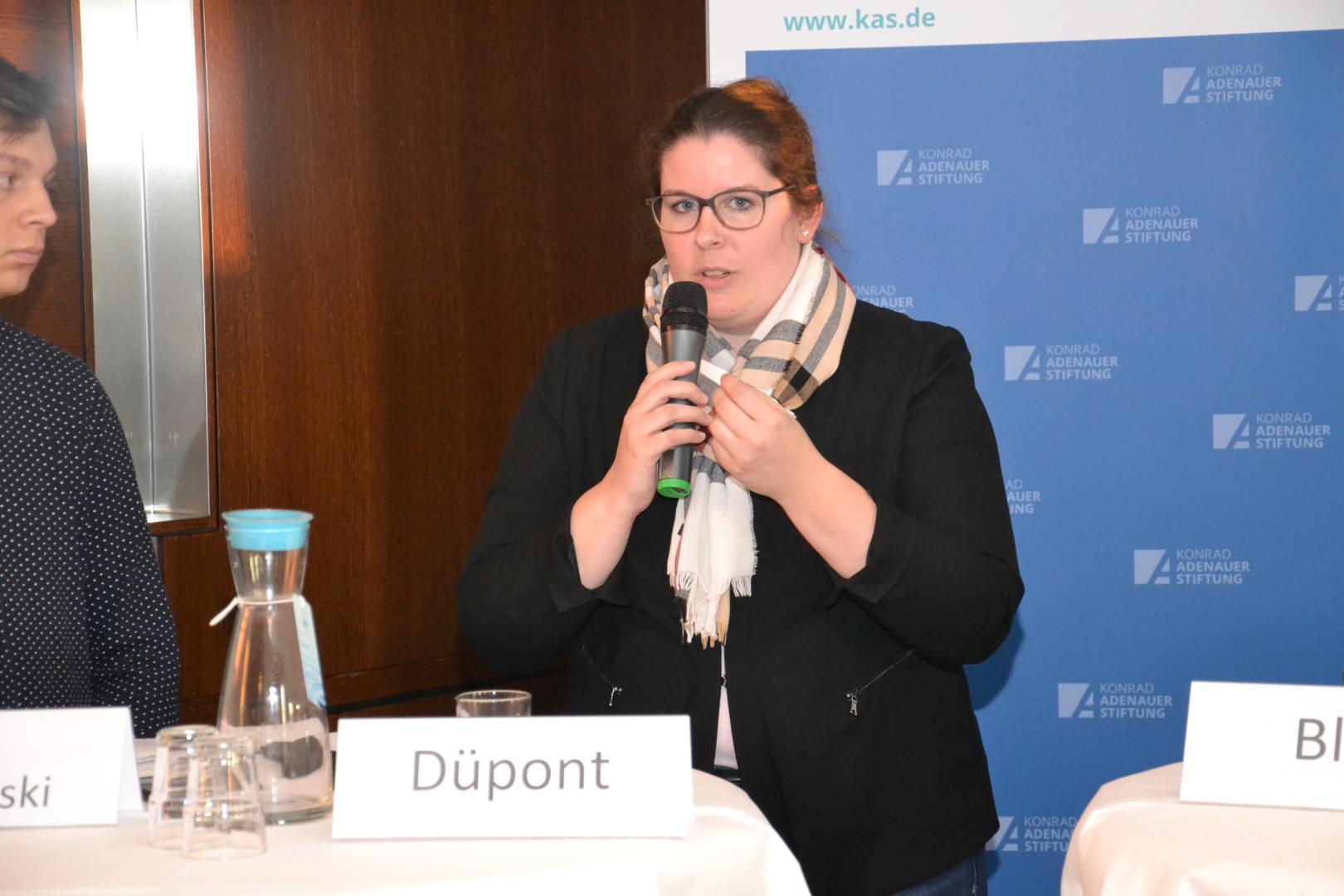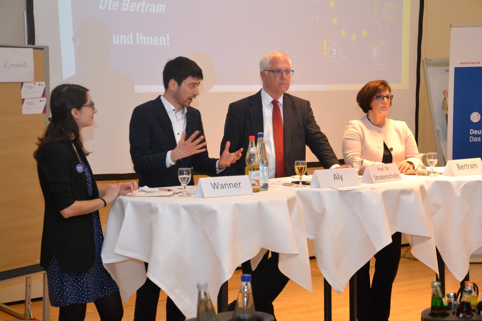Die grundlegende Frage, wie wir die Europäische Union in Zukunft zusammenhalten, fasste Eckart Stratenschulte in drei zentralen Punkten zusammen: Die EU muss sozial, sicher und souverän sein, erst dann wird sie eine Zukunft haben. Das sei aber nur zu verwirklichen, wenn sich die Union stärker ihre Macht- und Einflussmöglichkeiten in der Welt bewusst wird. Eine solche Union läge laut Eckart Stratenschulte im originärem Interesse Deutschlands: „Denn wenn die EU untergeht, wird es wie auf der Titanic sein. Wir als Deutsche sitzen dann vielleicht in der 1. Klasse mit Champagner, aber untergehen würde wir so oder so.“ Lena Düpont fügte dem hinzu, dass es wichtig sei, sich Zeit zum Nachdenken zu nehmen. Zwischen all den Krisen und Herausforderungen brauche man auch Phasen, in denen man gründlich überlegt, wie soll die EU weiterentwickelt werden. Tobias von Gostmoski, der Vorsitzende der Jungen Europäischen Föderalisten, wünschte sich in diesem Zusammenhang, dass in der öffentlichen Debatte noch stärker über die Zukunft Europas diskutiert werden würde. Er bedauerte es, dass weiterhin über das ob und nicht das wie in Bezug auf die Zukunft der EU diskutiert wird. Dadurch würden zukunftsweisende Themen, wie die Innovationskraft oder die soziale Verantwortung der EU, in den Hintergrund geraten.