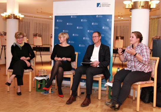 Zu Beginn erinnerte Dr. Brigitta Triebel, Konrad-Adenauer-Stiftung, an ein Foto, das im Juli die Titelseite vieler Tageszeitungen füllte: Die drei Politikerinnen Angela Merkel, Annegret Kramp-Karrenbauer und Ursula von der Leyen nebeneinander. Ist das als ein starkes Signal zu verstehen, wie weit die Gleichberechtigung in der deutschen Politik vorangeschritten ist? Nach Aussagen der Podiumsgäste gibt es trotz der drei mächtigen Frauen noch Nachholbedarf, was den Frauenanteil in Parteien und Parlamenten anbetrifft. Während in Schweden der Frauenanteil in der Politik bei 47 Prozent liegt, sind es in Deutschland auf Bundeseben etwa 31 Prozent, auf Landes- und Kommunalebene sind die Zahlen noch niedriger.