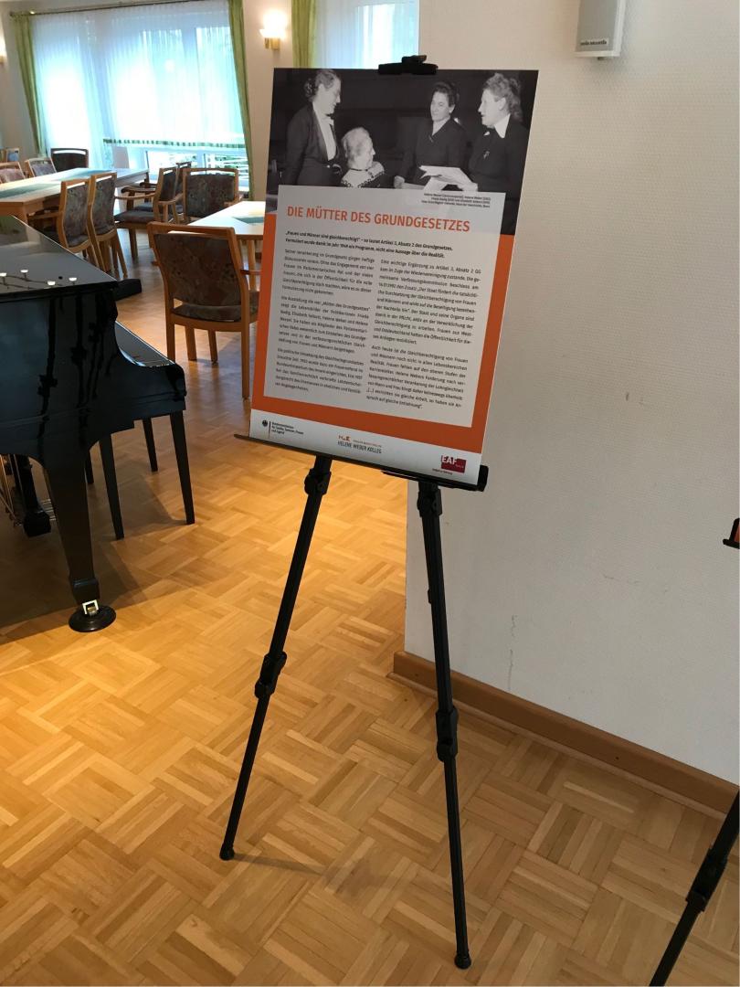 Die Abendveranstaltung war eingebettet in eine Veranstaltungsreihe, die Susanne Herweg vom Kommunalen Präventionsrat (KPR) begleitend zur Ausstellung „Mütter des Grundgesetzes“ organisiert hat. Damit wird an „70 Jahre Grundgesetz“ und „100 Jahre Frauenwahlrecht“ erinnert. In unserer Diskussion spielte jedoch die Vergangenheit weniger eine Rolle, sondern die Podiumsgäste beschäftigten sich mit der Gegenwart und der Zukunft für Frauen in Parteien und Parlamenten.