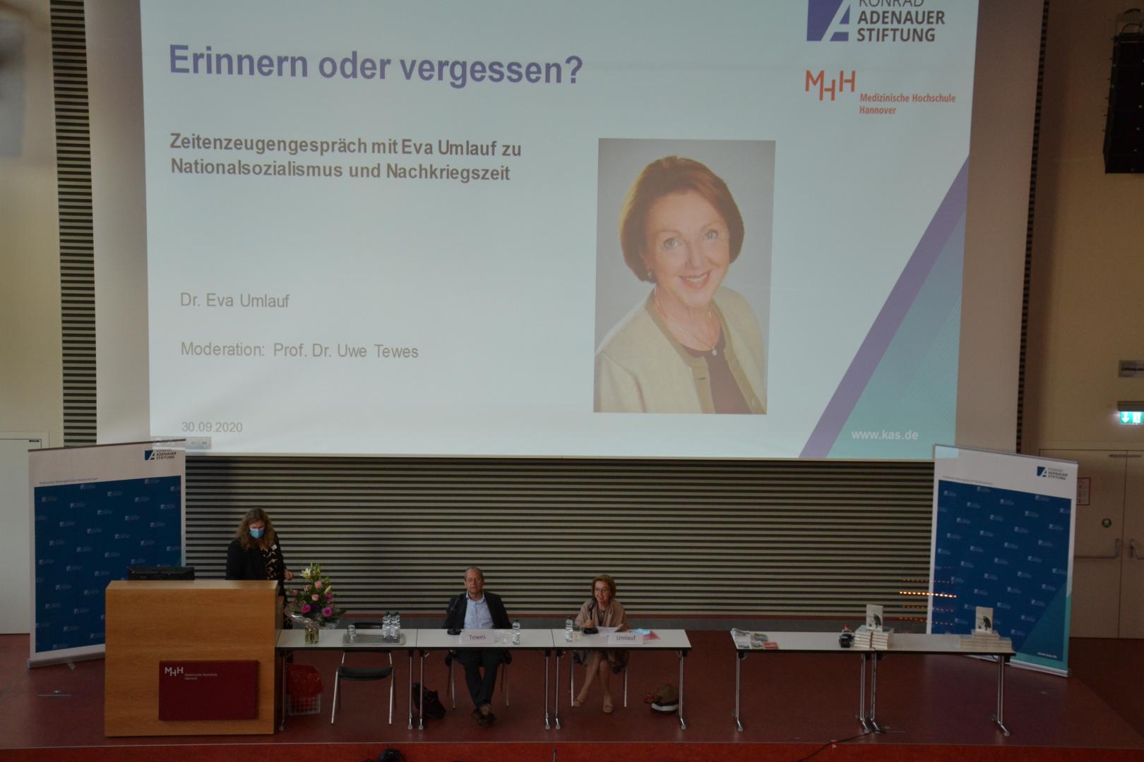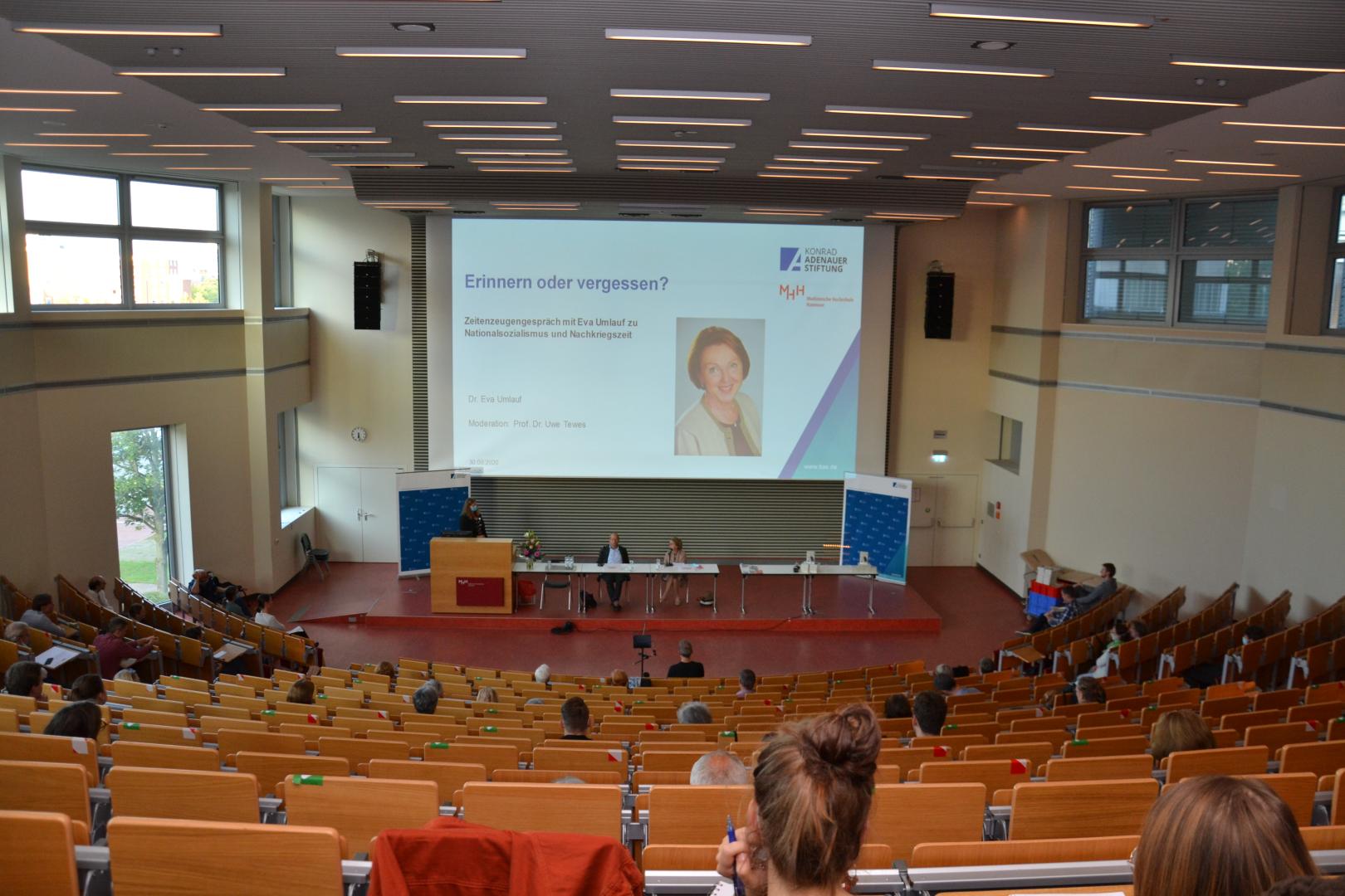 Die Nachwirkungen des NS-Regimes sind bis in die heutige Zeit spürbar. Mit dem versuchten Massenmord an Juden in Halle vor ca. einem Jahr kann dies anhand eines traurigen Beispiels verdeutlicht werden. Deshalb organisierte das Politische Bildungsforum Niedersachsen der Konrad-Adenauer-Stiftung e. V. und die Medizinische Hochschule Hannover (MHH) am 30.09.2020 ein Zeitzeugengespräch unter dem Titel „Vergessen oder erinnern“ mit der Auschwitz Überlebenden Dr. Eva Umlauf. Die Veranstaltung fand im Hörsaal F der MHH statt und es nahmen insgesamt ca. 70 interessierte Personen an diesem Vortrags- und Gesprächsformat teil.