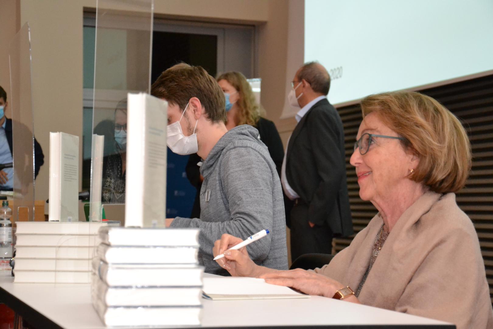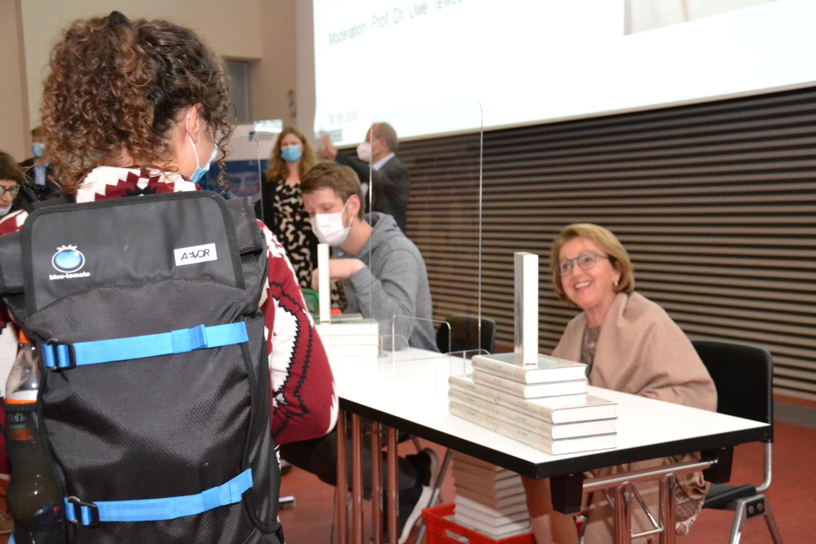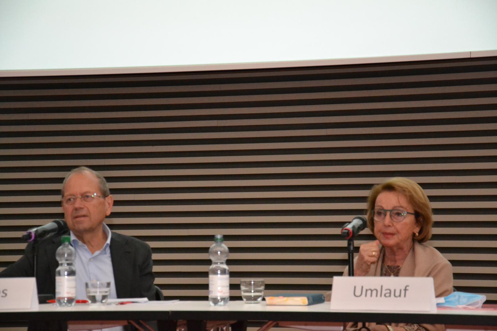 Anschließend an den Vortrag und die Lesung von Frau Dr. Eva Umlauf gab es für das Publikum die Möglichkeit, Fragen an die Zeitzeugin zu stellen. Unter der Moderation von Prof. Dr. Uwe Tewes wurde diese Möglichkeit in vielfältiger Form genutzt. Einerseits wurden Fragen zu ihrer Vergangenheit gestellt. So zum Beispiel Fragen zu ihrer Schulzeit und den Erfahrungen nach der Lagerinhaftierung, antisemitischen Lebenserfahrungen sowie den langfristigen gesundheitlichen Folgen durch den Aufenthalt in den Konzentrationslagern.  Andererseits wurden ebenso Fragen zu aktuellen Gesichtspunkten der Debatte gestellt. Beispiele hierfür waren Fragen zur zukünftigen Entwicklung des Antisemitismus, zum heute bestehenden Groll gegenüber Tätern, der Umzug nach Deutschland und warum konkret heute der Antisemitismus wieder an Wirkungsmacht gewinnt.
