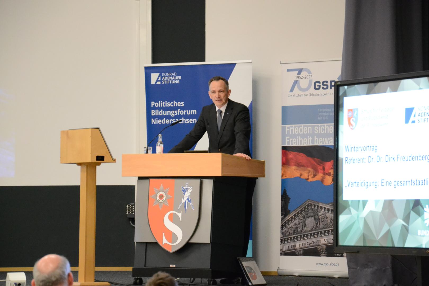 Dr. Freudenberg eröffnete seine Ausführungen mit einem besonders aktuellen Bezugspunkt: Der russische Angriffskrieg auf die Ukraine, der als einer der entscheidenden Faktoren für eine Neuausrichtung der Sicherheits- und Verteidigungspolitik in Europa gilt. Dr. Freudenberg wies darauf hin, dass dieser Krieg die Bedeutung eines funktionierenden Zivilschutzes und einer gesamtstaatlichen Verteidigungsstrategie deutlich gemacht habe. Die militärischen Auseinandersetzungen in der Ukraine, aber auch die gezielten Cyberangriffe, Desinformationskampagnen und die Bedrohung kritischer Infrastruktur, sind anschauliche Beispiele für die hybride Kriegsführung, die Europa und auch Deutschland bedrohen könnte.