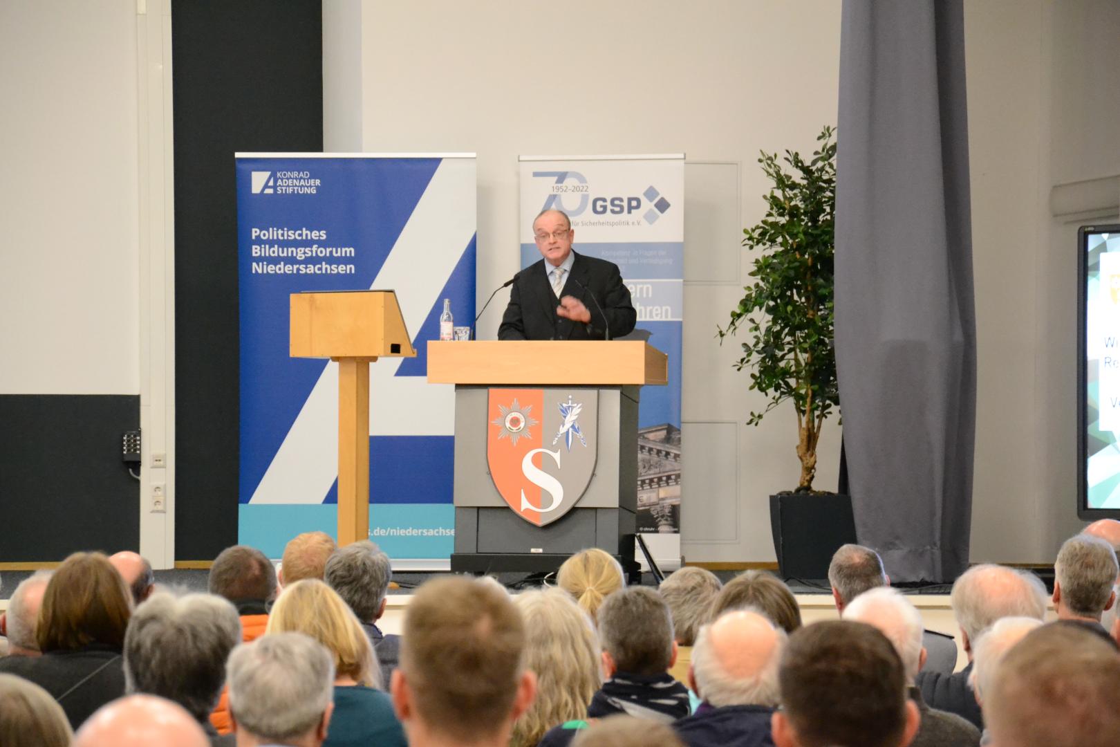 Mit einem eingehenden Blick auf den Zivilschutz, der als essenzieller Bestandteil der gesamtstaatlichen Verteidigungsstrategie gilt, führte er in seinem Vortrag fort. Der Zivilschutz zielt darauf ab, die Bevölkerung vor den Gefahren eines bewaffneten Konflikts zu schützen und die Funktionsfähigkeit des Staates zu gewährleisten. Er hob hervor, dass der Zivilschutz nicht nur eine Aufgabe der Bundesregierung, sondern eine gesamtgesellschaftliche Verantwortung sei, die sowohl den Bund als auch die Länder, die Kommunen, sowie die Zivilgesellschaft einbeziehe.