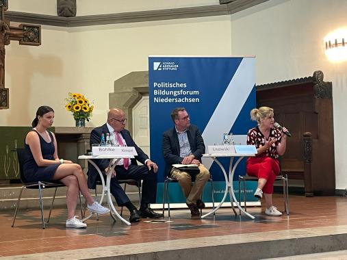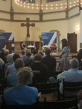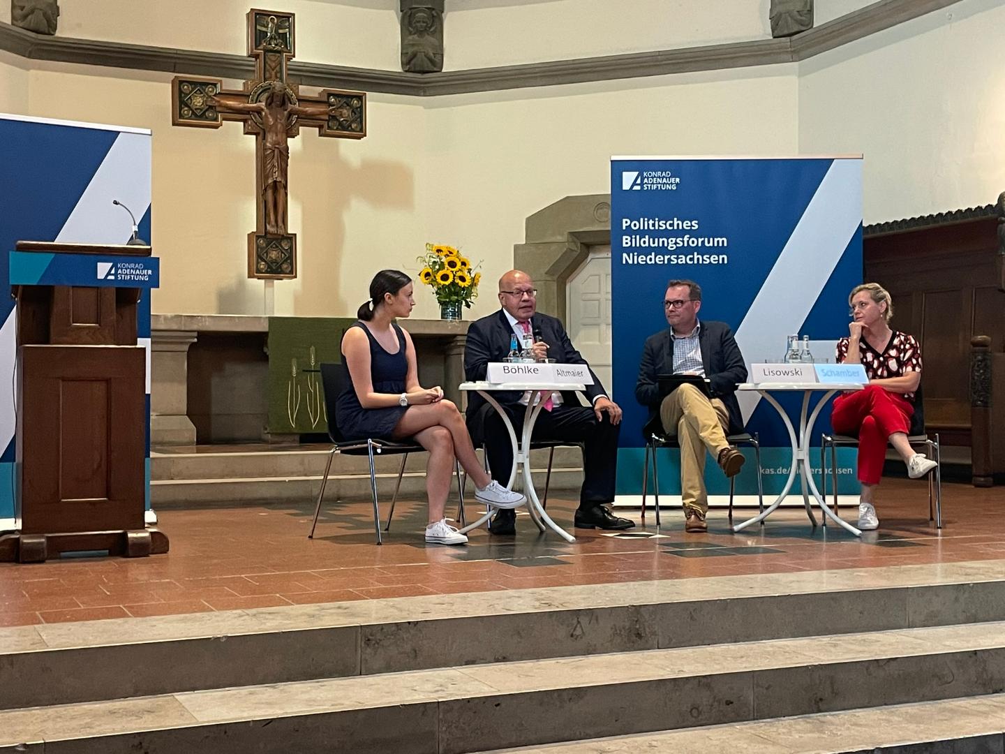 An Herrn Lisowskis Impulsvortrag schloss eine gemeinsame Diskussion, moderiert von Rika Böhlke, an. Neben Herrn Lisowski und Frau Böhlke ergänzten Peter Altmaier, Bundesminister A. D., und die SPD-Bundestagsabgeordnete Rebecca Schamber das Podium. Altmaier und Schamber berichteten auch von ihren persönlichen Erfahrungen, beide kritisierten die aggressive Stimmung im gegenwärtigen politischen Diskurs.