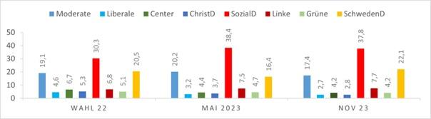 Unterdessen ist der NATO-Prozess Schwedens weiter am Stocken. Regelmäßig stellt der türkische Präsident Erdogan neue Bedingungen für die türkische Ratifizierung des schwedischen NATO-Beitritts. Zuletzt wurde bekannt, dass die Türkei die Schließung einer gegenüber der türkischen Regierung kritischen Website verlangt. Gerade für die Moderaten ist der NATO-Beitritt Schwedens schon lange sehr wichtig, die Verzögerung ist daher mit erheblichem Frust verbunden. Wenn Schweden schließlich in den Kreis der NATO-Mitglieder aufgenommen wird, werden die Moderaten davon profitieren.