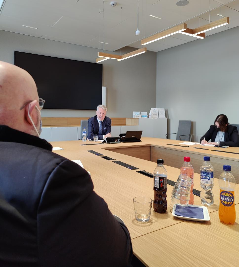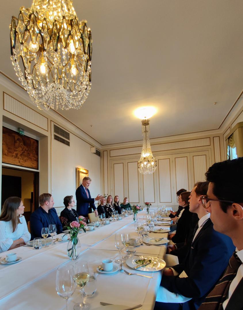 On Friday, April 1st, the group was welcomed to the party offices of the Swedish People’s Party (SFP), where Anders Adlercreutz, MP and head of the SPF party group in Finland’s parliament, the Eduskunta/Riksdagen, who spoke about the at the time ongoing Finnish NATO debate. Following Mr. Adlercreutz, the MP for Åland, Mats Löfström, spoke about the role of Åland’s single MP as part of the SFP party group, and the defense status of the Åland islands. Leaving the SFP party office, the group was treated to lunch by the Finnish Institute for International Affairs (FIIA), where they were welcomed by institute vice director Samu Paukkonen, Senior Researcher Matti Pesu, and Head Researcher Charly Salonius-Pasternak. Following lunch, the group discussed at length the NATO debate in Sweden and Finland with the present FIIA researchers. After the FIIA visit, the group met the Vice-President of Kokoomus Elina Valtonen at the Annex building of Parliament, where Valtonen spoke about her current work in the realm of EU politics and the Future of the EU. After this, the group met the foreign minister of Finland, Pekka Haavisto, at the Foreign Ministry offices at Katajannokka.