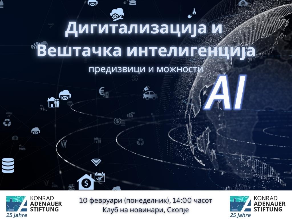 The Konrad Adenauer Foundation (KAS) is pleased to invite you to be part of the event “Digitalization and artificial intelligence- challenges and opportunities” which will take place on the 10th of February at Klub na novinari Skopje starting at 14:00 o’clock.