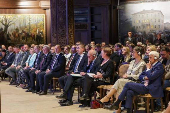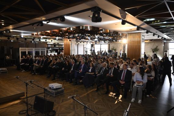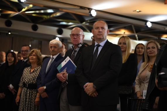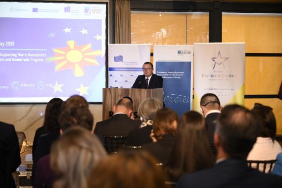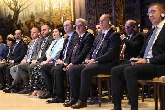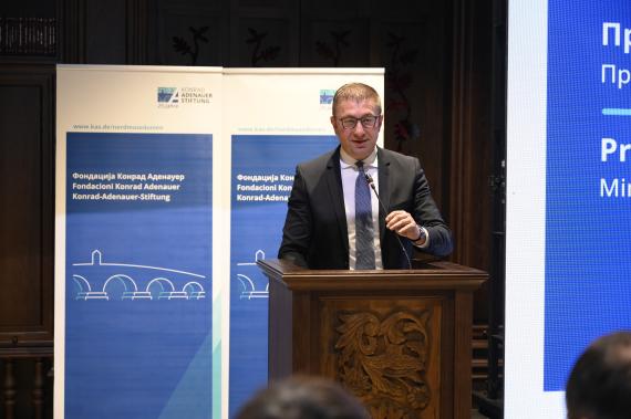 Im Anschluss an die Begrüßungsrede von Daniel Braun würdigte Premierminister Hristijan Mickoski die langjährige Präsenz der Konrad-Adenauer-Stiftung im Land. Er betonte den Beitrag der Stiftung für die Politische Bildung im Land und als Partner im Netzwerk der Europäischen Volkspartei. Mickoski erinnerte an die Zeit, in der seine Partei VMRO-DPMNE mit großer Skepsis konfrontiert war, die KAS jedoch weiterhin ein Partner blieb. Er würdigte, dass die Konrad-Adenauer-Stiftung stets ein verlässlicher Partner gewesen sei und dass diese langjährige Zusammenarbeit, nun im Rahmen der Regierungsverantwortung, zu den Fortschritten Nordmazedoniens bei der Verwirklichung seiner europäischen Ziele beitragen werde.