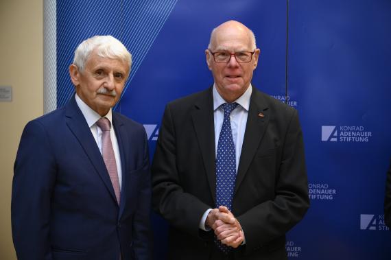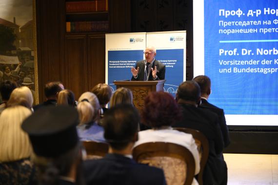 Der Vorsitzende der Konrad-Adenauer-Stiftung und ehemalige Bundestagspräsident Prof. Dr. Norbert Lammert, unterstrich in Anlehnung an die Regierungsrolle der VMRO-DPMNE die langfristige Wirkung des Stipendienprogramms der Stiftung und hob dessen Rolle bei der Ausbildung künftiger Führungskräfte im In- und Ausland hervor. Er verwies auf die Beispiel der KAS-Altstipendiaten in den Personen von Bundeskanzler Friedrich Merz und Außenminister Johann Wadephul als Beleg für den Beitrag der KAS in der deutschen Politik .Dieser Erfolge seien auch in Nordmazedonien mit zwei Altstipendiaten als aktuelle Minister sichtbar. Lammert führte zur Bedeutung der Auslandsarbeit politischer Stiftungen aus Deutschland aus, dass gute Programme gleichfalls gute Partner vor Ort benötigten. Hinsichtlich der Europäischen Integration erinnerte Lammert an Aussagen Adenauers, dass Europa gerade sicherheitspolitisch mehr Verantwortung für sich selbst übernehmen müsse bei der inneren Ausgestaltung der EU sich jedoch nicht durch zu viel Perfektionismus selbst im Weg stehe sollte.