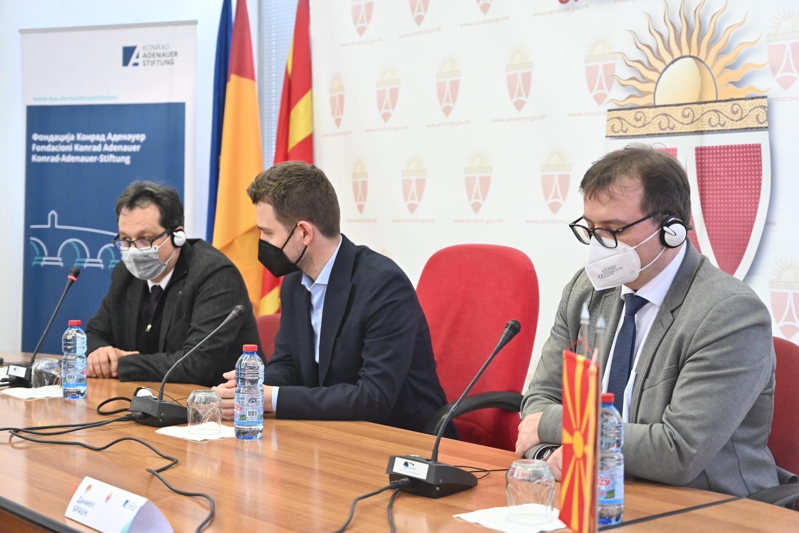 An der Pressekonferenz nahmen der Leiter des Auslandsbüros Nordmazedonien und Kosovo, Daniel Braun, der Dekan der Rechtswissenschaftlichen Fakultät „Justinian I“, Sasho Georgievski, sowie der Bürgermeister der Gemeinde Aerodrom, Timcho Mucunski, teil.