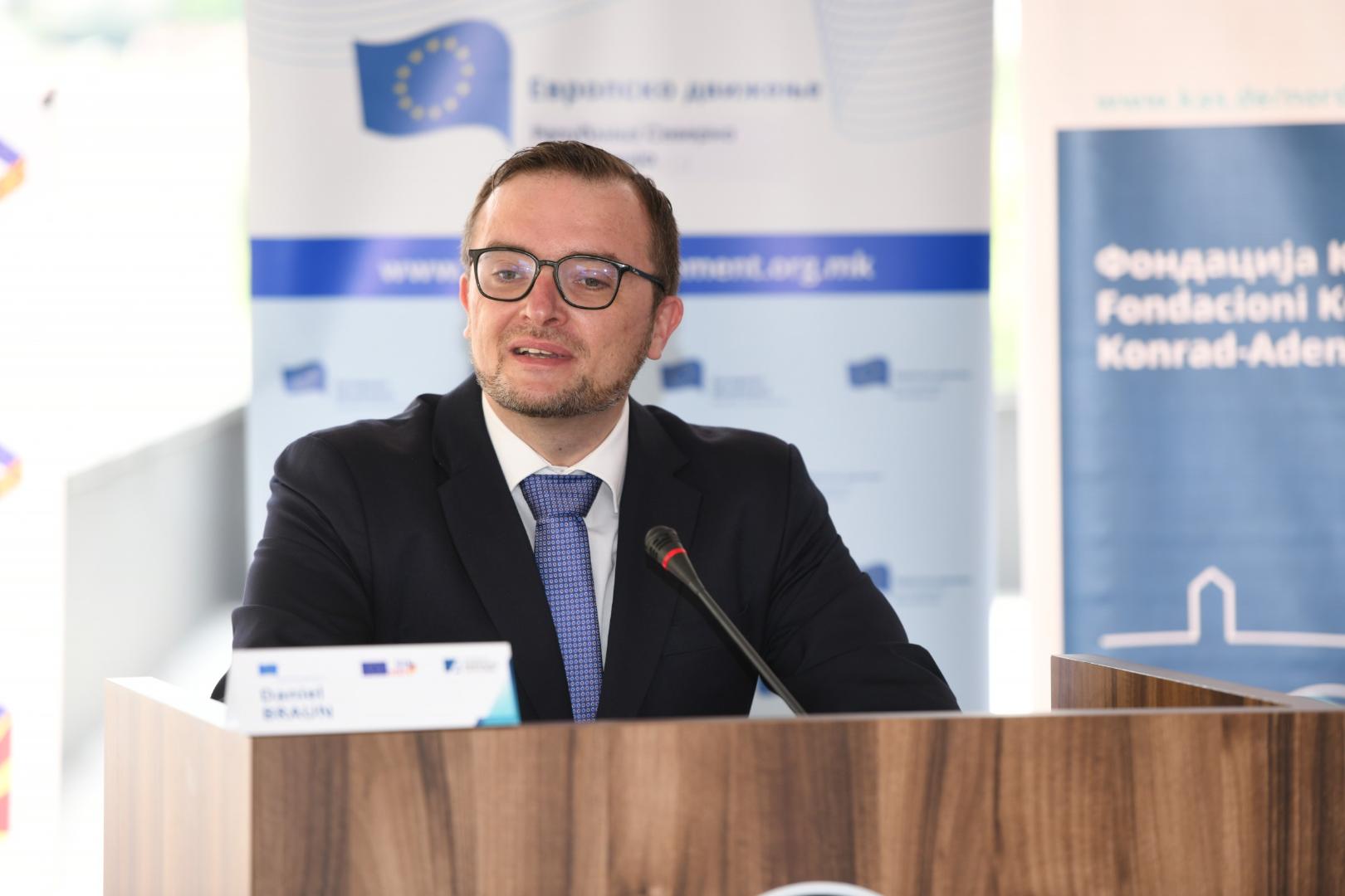 Daniel Braun, Leiter des Auslandsbüros der KAS in Skopje, hob in seinem Eröffnungsbeitrag hervor, dass sowohl die Konrad-Adenauer-Stiftung als auch Deutschland den EU-Integrationsprozess Nordmazedoniens bereits seit 2005, als das Land den Kandidatenstatus erlangte, unterstützen. In der Pandemie war die EU leider nicht schnell in der Lage, die Länder der Region mit Impfdosen zu unterstützen, während Akteure wie China erfolgreicher waren. Die vermeintlich größere Effizienz Chinas sollte jedoch nicht davon ablenken, dass die EU als Wertegemeinschaft demokratischer Staaten weit mehr für Demokratie, Freiheit, Minderheitenrechte als auch Umweltschutz steht als andere Akteure. Das Entscheidungsprozesse manchmal länger dauern ist dem integrativen Diskussionsprozessen in einer Demokratie geschuldet, welche versucht, allen Menschen in Debatten einzubeziehen.