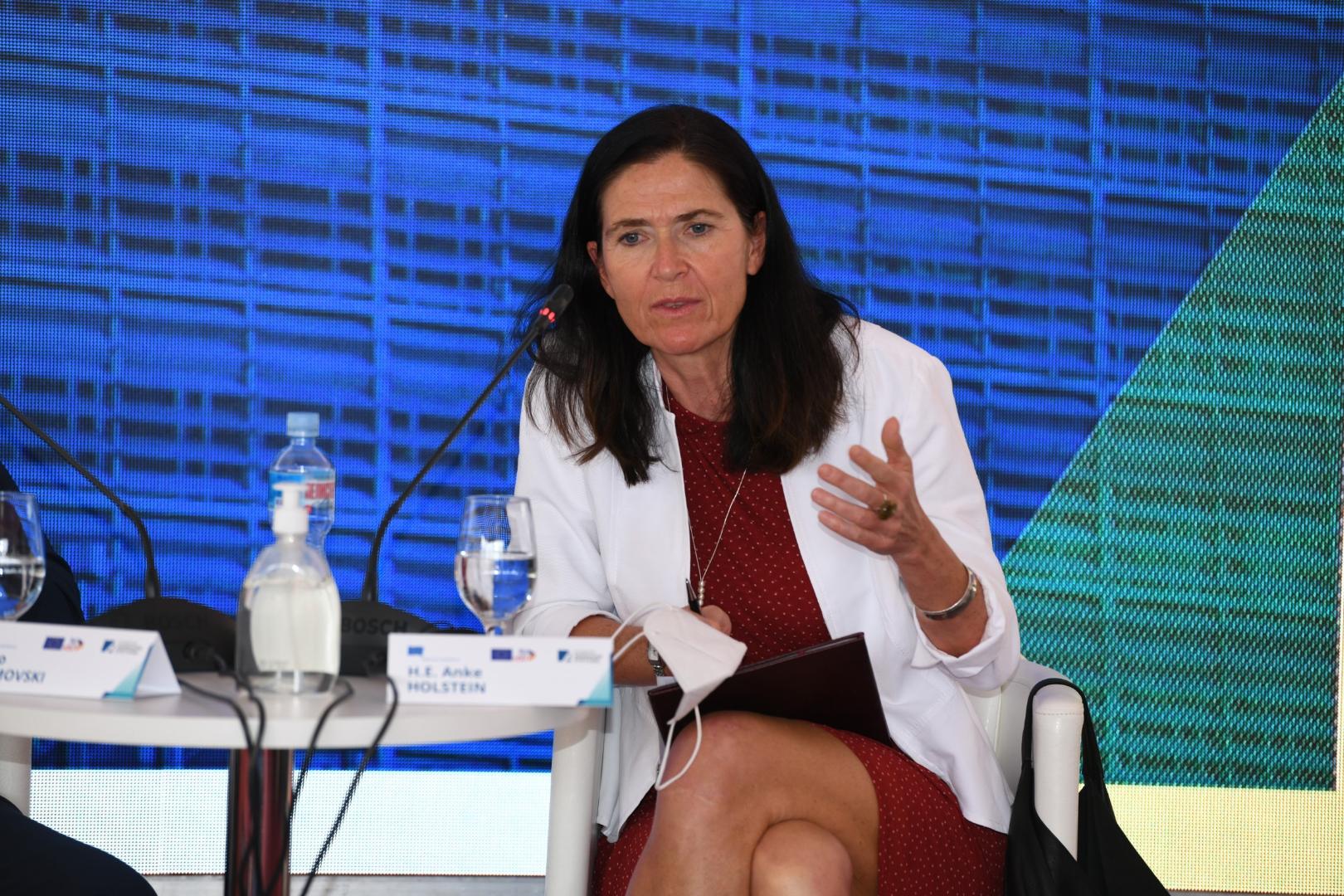 I.E. Anke Holstein, Botschafterin der Bundesrepublik Deutschland, stellte in ihrem Beitrag das Projekt "Zukunft Europas" vor, in dessen Rahmen Bürgerinnen und Bürger mitteilen können, in welchem Europa sie leben möchten, um so die Zukunft der EU mitzugestalten. Holstein bedauerte, dass das Prinzip der Einstimmigkeit allen Abschaffungsversuchen zum Trotz noch immer gelte, was besonders auf die Erweiterung negative Auswirkungen habe. "26 Mitgliedstaaten werden wegen geringfügiger nationaler Interessen von einem Staat sozusagen als Geiseln gehalten, was der gesamten EU schadet und ihre Glaubwürdigkeit auf dem Westbalkan beschädigt", sagte Botschafterin Holstein.