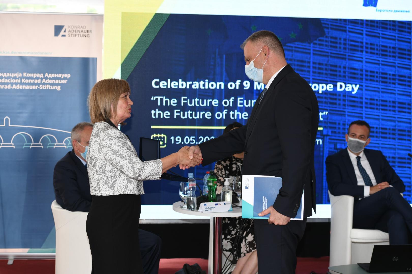 Am Ende der Diskussion verlieh Mileva Gjurovska die Auszeichnung der Europäischen Bewegung "Europäische Persönlichkeit 2020" an Dr. Ilir Demiri.