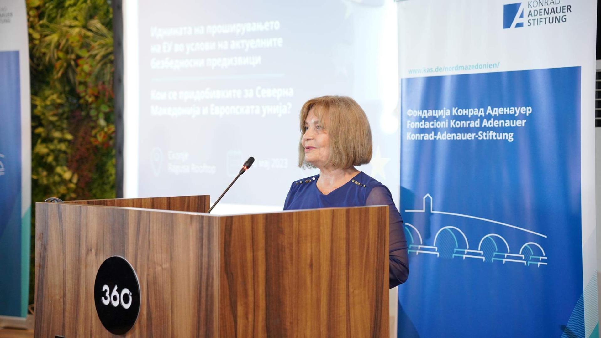 Professorin Mileva Gjurovska, Präsidentin der Europabewegung in der Republik Nordmazedonien, eröffnete die Veranstaltung und bedankte sich in ihrem Grußwort bei den Anwesenden für ihre Teilnahme in so großer Zahl. Sie hob hervor, dass die Bewegung jeden Tag den Europatag begehe, diesen Tag jedoch im Besonderen der Union widme. Da sich die Meinung der Bürger verfestige, dass das Land niemals der Union beitreten werde, sind ihrer Meinung nach größere Anstrengungen aller Beteiligten erforderlich, um die Zweifel am EU-Beitritt Nordmazedoniens auszuräumen. Wie sie unterstrich, werde laut Schuman Europa nur gehört, wenn es mit einer Stimme spreche und die wichtigste Botschaft bestehe ihm zufolge darin, den Frieden auf dem Kontinent zu bewahren. „Unsere Region, die vom russisch-ukrainischen Krieg betroffen ist, steht auch vor anderen Sicherheitsproblemen, was bedeutet, dass die europäische Perspektive in der Region viel greifbarer gemacht werden muss, als sie es jetzt ist.“ Professor Gjurovska beglückwünschte die Anwesenden zum Europatag und wünschte den Diskussionsteilnehmern eine fruchtbare Debatte.