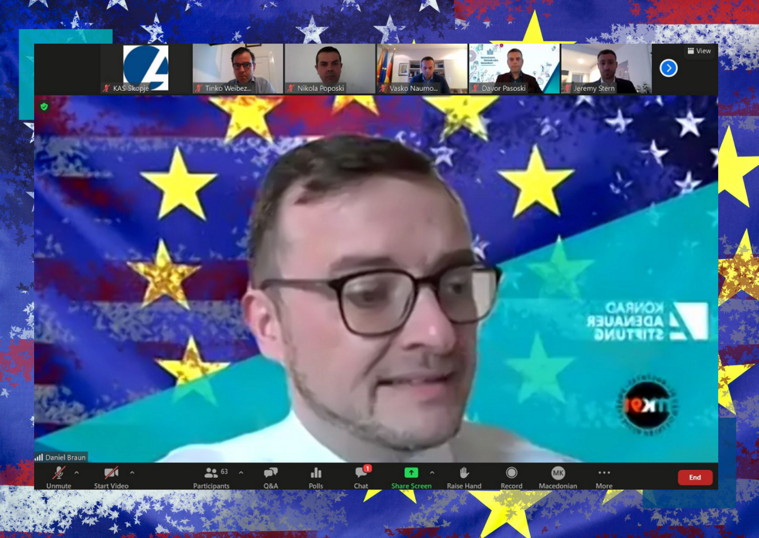 Zwei ehemalige Außenminister der Republik Nordmazedonien nahmen ebenfalls mit Beiträgen an der Veranstaltung teil. Antonio Miloshoski, derzeit Vorsitzender des Parlamentarischen Ausschusses für Auswärtige Angelegenheiten, ging bei seinem Rückblick auf die EU-Erweiterung auf dem Westbalkan insbesondere auf frühere und heutige bilaterale Streitigkeiten zwischen einigen Ländern der Region ein. Das Fehlen einer klaren EU-Strategie, die gestörte Wahrnehmung der Union bei Bürgerinnen und Bürgern der Balkanstaaten und der gebremste Erweiterungsprozess sind seiner Meinung nach die wichtigsten Herausforderungen, denen die EU auf dem Westbalkan gegenübersteht. Nikola Poposki, auch ehemaliger Botschafter der Republik Nordmazedonien bei der EU, sprach über Aspekte der Energiesicherheit und die Vorteile der Erweiterung — nicht nur für die Kandidatenstaaten und die EU selbst, sondern auch für die transatlantische Allianz. Die Diskussion moderierte der Vorsitzende von MK91 Vasko Naumovski, selbst ehemaliger Stellvertretender Premierminister und ehemaliger Botschafter in den USA. Er fasste die Beiträge zusammen und betonte zum Schluss, er hoffe auf eine Fortsetzung der Diskussion, nicht nur über die behandelten Aspekte, sondern auch über weitere Themen, die zu einer umfassenden Analyse der transatlantischen Beziehungen und der EU-Erweiterung beitragen.