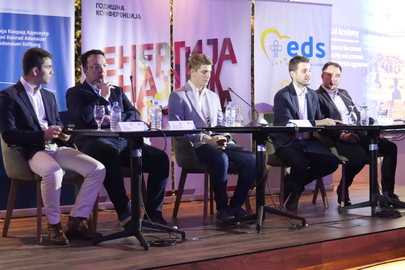 Die anschließende Podiumsdiskussion behandelte das Thema “Politische, wirtschaftliche und energierelevante Auswirkungen des Kriegs in der Ukraine auf Europa”. Als Diskussionsredner nahmen Gordana Dimitrieska Kochoska, stellvertretende Vorsitzende der VMRO-DPMNE und Finanzexpertin, Aleksandar Spasenovski, Professor an der rechtswissenschaftlichen Fakultät “Justinian I” in Skopje sowie die frühere Abgeordnete Elena Markova Velinova, Expertin im Bereich Energetik, und Ivan Botucharov, Generalsekretär der EDS, teil. Die Diskussionspartner gingen in ihren Beiträgen in Bezug auf die Auswirkungen des Kriegs in der Ukraine auf jene Bereiche ein, in denen sie Experten sind.