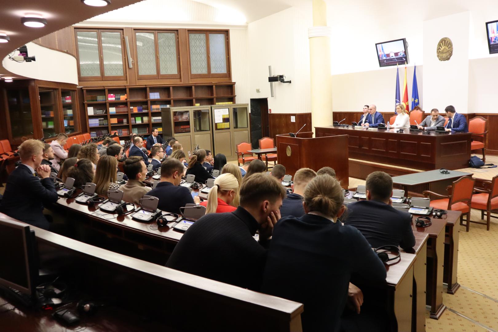 Der zweite Veranstaltungsteil begann mit einem organisierten Besuch im mazedonischen Parlament und einem Treffen mit den Abgeordneten Antonio Miloshoski, Vorsitzender des außenpolitischen Ausschusses sowie den Mitgliedern des Klubs für Jugendfragen und –politik, Jovan Jauleski, Marija Petrushevska und Bojan Stojanoski. Besprochene Themen dieses Treffens waren Außenpolitik, die EU-Perspektiven der Länder der Region des Westbalkan, der Aktionsplan des Klubs für Jugendfragen und –politik sowie die Partizipation junger Menschen im Beschlussfassungsprozess.
