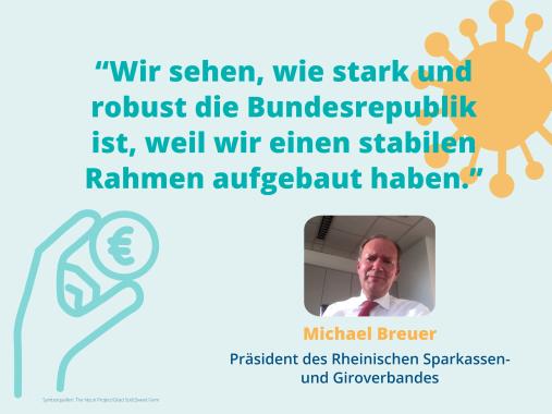 Diese Fragen diskutierte Michael Breuer, Präsident des Rheinischen Sparkassen- und Giroverbandes, bei Kreis Düren im Gespräch mit den Zuschauerinnen und Zuschauern. Zunächst begrüßte die Leiterin des Regionalbüros Rheinland, Simone Gerhards, die Gäste und sprach die vielen Ebenen an, die im Bereich Finanzen betroffen sind: „Große und kleine Unternehmen, Selbstständige und zuletzt wir Bürgerinnen und Bürger bekommen die Auswirkungen der Pandemie gerade zu spüren – und reines Sparen ist nicht die Lösung dieses gesamtgesellschaftlichen Problems.“ Anschließend begrüßte der Schirmherr der Veranstaltung, Thomas Rachel MdB, das Publikum: „Hinter uns liegen 15 Monate, die für viele eine große wirtschaftliche Herausforderung waren.“ Die Bundesregierung habe mit den Hilfspaketen das Ziel gehabt, „die wirtschaftliche Leistungsfähigkeit zu erhalten und andererseits Menschen auch zu ermöglichen, wieder Fuß zu fassen.“ Das sei nur möglich gewesen, weil in den Jahren davor klug gewirtschaftet und gespart wurde, sodass Grundlagen da gewesen seien, die genutzt wurden.