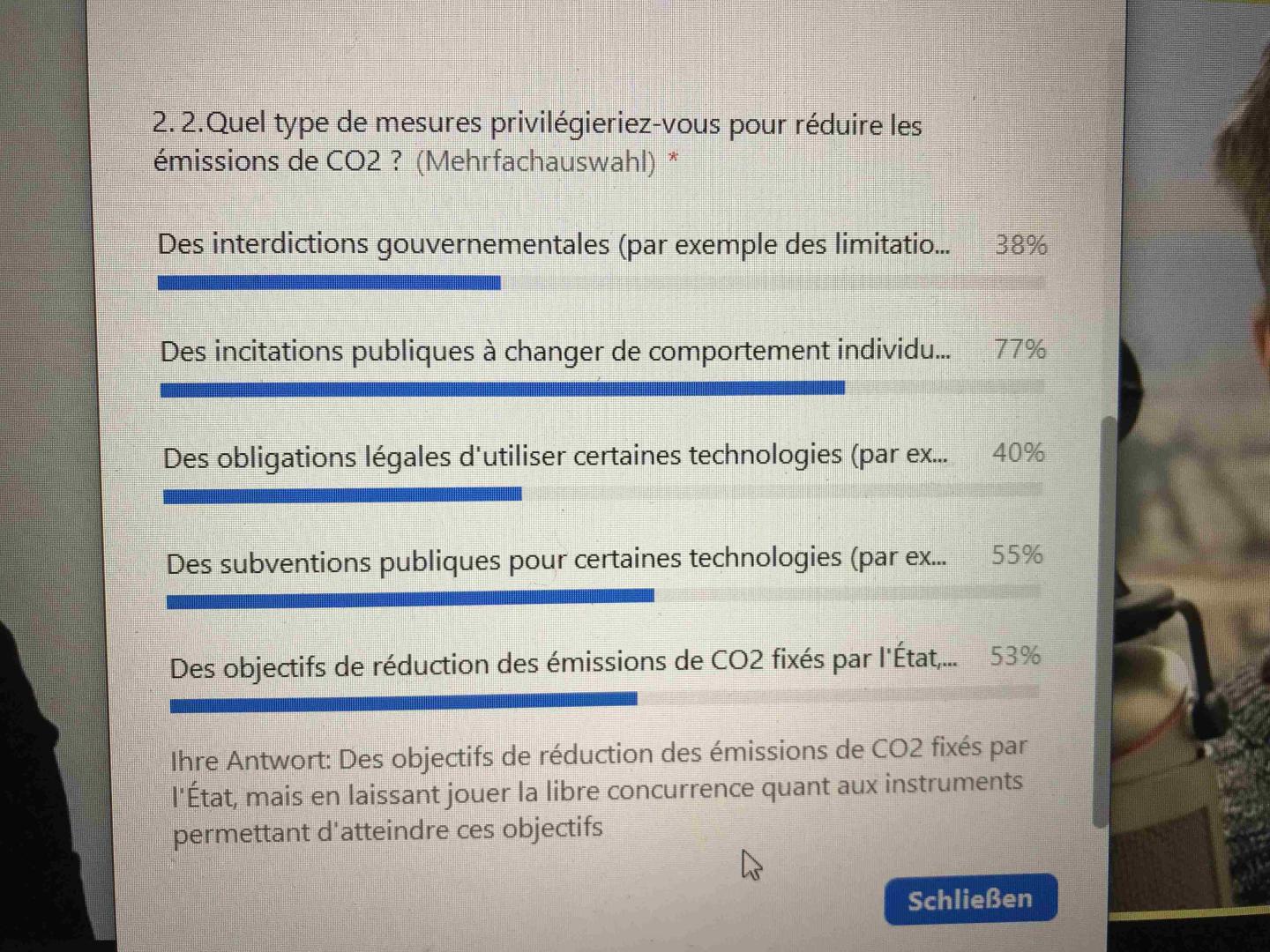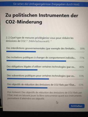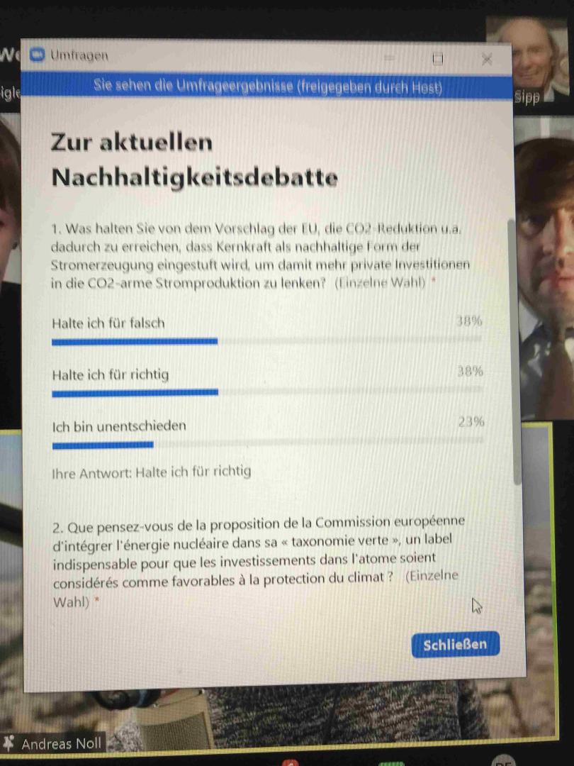 Der Energieexperte aber zielte auf zwei Schwachpunkte der Klimadebatte: die unterschiedlichen Präferenzen bei der Wahl der Brückentechnologie und die soziale Belastung der Menschen, die sich auf die Akzeptanz der Klimawende auswirke. Er schloss sich grundsätzlich der Auffassung an, dass auch Frankreich den Ausbau der Erneuerbaren vorantreiben müsse und bezweifelte wie seine deutsche Gesprächspartnerin grundsätzlich die Nachhaltigkeit der Atomkraft, vertrat aber die These, dass sie als Brückentechnologie für die Decarbonisierung dringend benötigt werde. Die Substitution von Kernkraft durch Gaskraft sei klimapolitisch ein Fehler, da die Effekte der CO2-Minderung deutlich geringer seien. Deutschlands Abhängigkeit vom Gas berge außerdem geopolitische Risiken. Der Vorteil der Atomkraft liege hingegen darin, dass die Stromkosten für die Bevölkerung durch einen weniger überstürzten Ausbau der erneuerbaren Energiequellen in einem verträglichen Umfang gehalten werden könnten. In Frankeich jedenfalls sah er die Belastungsgrenze für die Bevölkerung erreicht. Die Franzosen seien nicht bereit, den Gürtel enger zu schnallen. Außerdem stünden sie den erneuerbaren Energien weitaus skeptischer gegenüber als die Deutschen. Das Klima stehe bei den Franzosen nicht so sehr im Mittelpunkt der politischen Aufmerksamkeit wie in Deutschland. Macron habe aus dem Gelbwestenprotest gelernt und werde sich auf das deutsche Abenteuer – dem Verzicht auf Energie aus Atom und Kohle – nicht einlassen. Frankreich könne sich die Subventionierung des Ausbaus der erneuerbaren Energiekraftwerke nicht leisten, da es höhere Ausgaben für seine internationalen Verpflichtungen hätte.