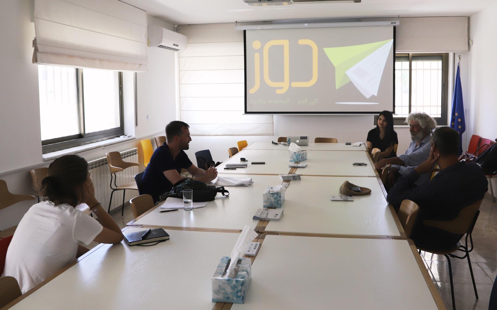 Anschließend traf sich die Delegation mit Salem Barahmeh und Inès Abu Razek vom KAS Partner Palestinian Institute for Public Diplomacy (PIPD). PIPD ist eine junge Organisation, die darauf abzielt das Bewusstsein für aktuelle Probleme in der palästinensischen Gesellschaft zu schärfen und die Fähigkeiten der palästinensischen öffentlichen Diplomatie zu stärken. Es entstand eine lebhafte und fruchtbare Debatte, und sowohl die Delegation als auch das PIPD konnten sich über ihre Erfahrungen mit staatsbürgerlicher Bildung und gesellschaftlichem Engagement austauschen. Die besondere Situation Deutschlands in dem Konflikt mit Israel wurde ebenfalls angesprochen. Die letzte Station des Tages war die in Nablus ansässige unabhängige palästinensische Medienplattform „Dooz“, die von Jalaa Abu Arab und ihrem Gründer Abed Othman vertreten wurde und sich zur Aufgabe gemacht hat, die Kluft zwischen Journalisten und Bürgern in Nablus und der gesamten Westbank, zu überbrücken. Dooz organisiert tägliche Meinungsumfragen, Online-Dialoge zwischen Beamten und Bürgern sowie Schulungsworkshops für Journalisten. Die Delegation war sehr interessiert an ihrer Arbeit und gemeinsam planten sie, einen gemeinsamen Trainingstag für deutsche und palästinensische Journalisten zu organisieren.