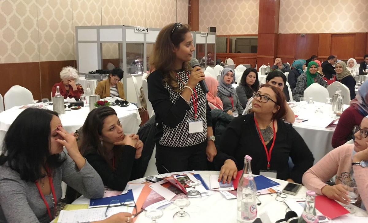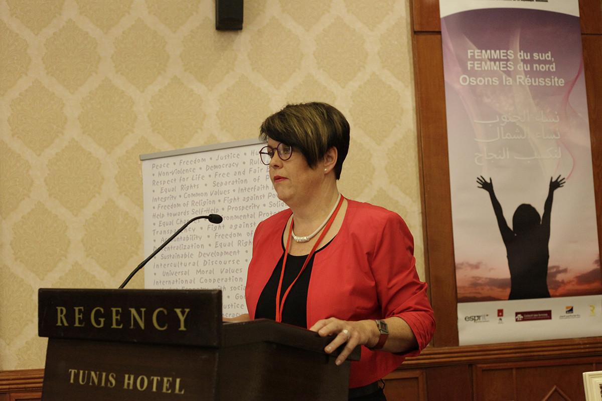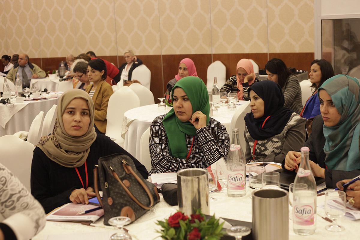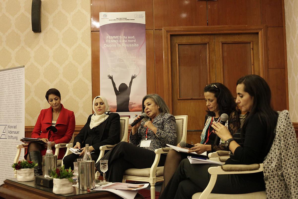 Die Konferenz gab Frauen die Möglichkeit ihre Erfolgsgeschichten zu teilen, v.l.n.r.: Juana Borrego Izquierdo, Präsidentin von Femur; Zohra Benlakhdar, Wissenschaftlerin; Ikbal Gharbi, Vize-Präsidentin und Gründungsmitglied der Tunisian League for the Defense of Freedom of Artistic and Scientific creation; Keltoum Kennou, Richterin und Kandidatin in den Präsidentschaftswahlen 2014; Dilara Hakan, Wissenschaftlerin und Mitglied der Europäischen Bewegung in der Türkei